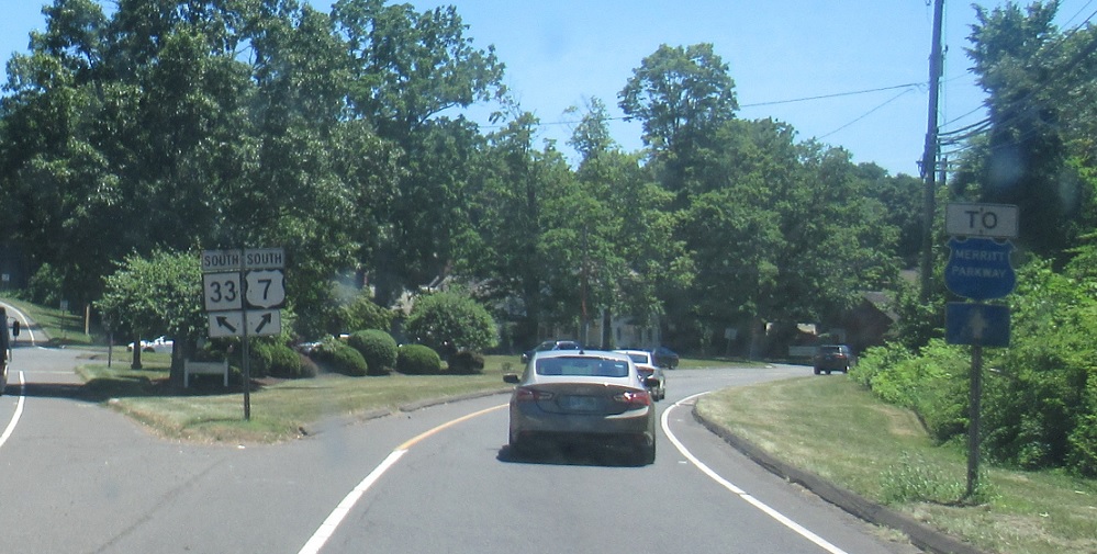 Keep left for CT 33 south and right for US 7 south. Follow US 7 to the CT 15 Merritt Parkway.