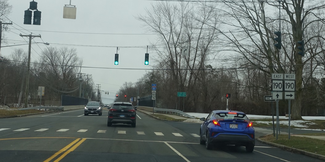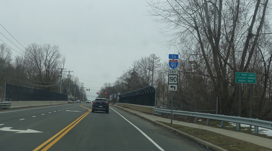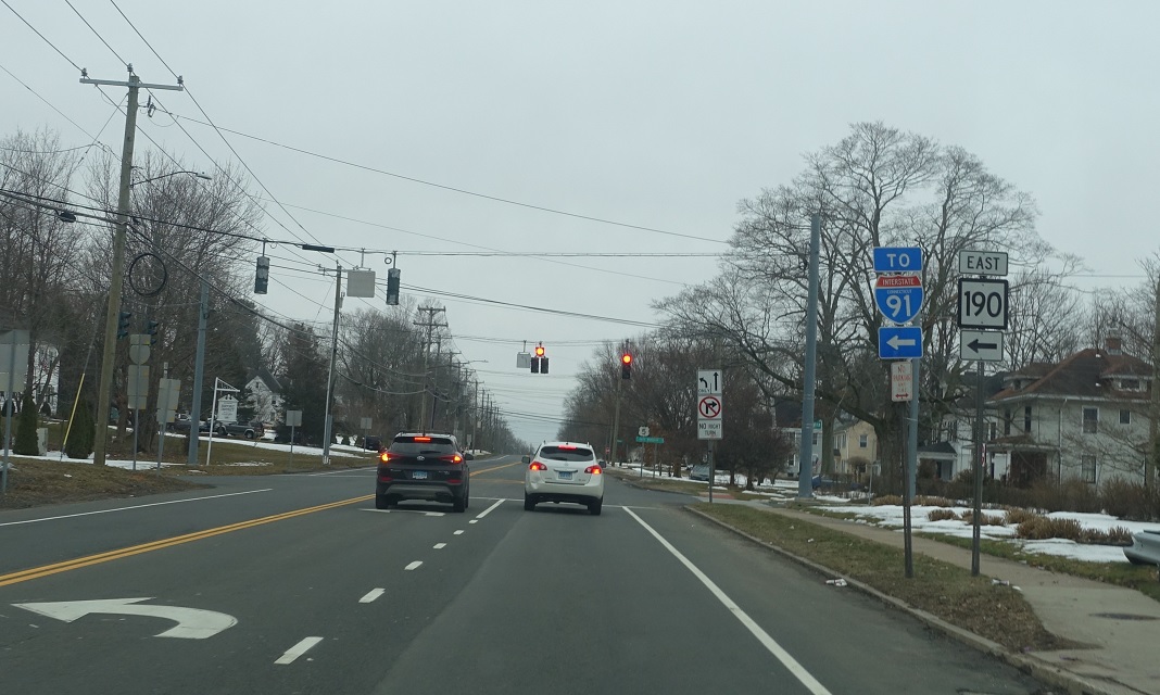 Turn left for CT 190 east to I-91. SR 515 approaches on the right and carries traffic from 190 east to US 5.