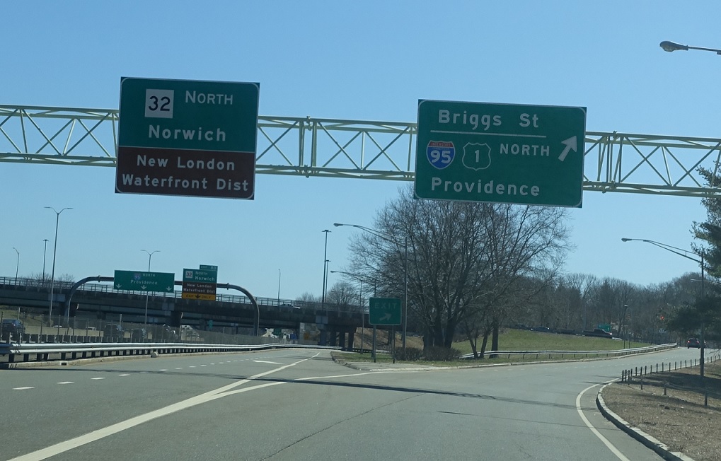 Just after US 1 joins the south frontage road, keep right to exit off of it to head towards I-95. SR 641 takes over the frontage road and connects to CT 32 north via SR 635/Williams St. It’s worth noting it may actually be faster to get onto 32 north via US 1 north to SR 636.