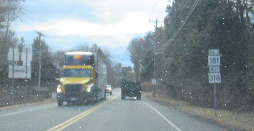 Shortly thereafter, keep right to stay on 181 south/318 west as the two routes turn to face west. Just after the bend, we’ll approach SSR 482, which follows the east bank of the Farmington River up to Riverton.