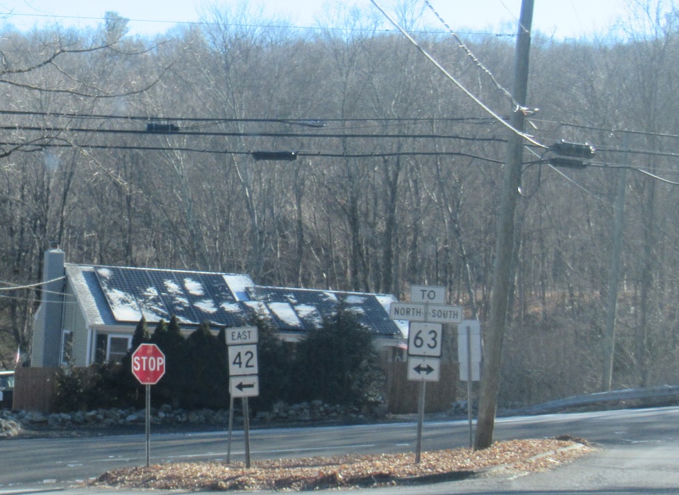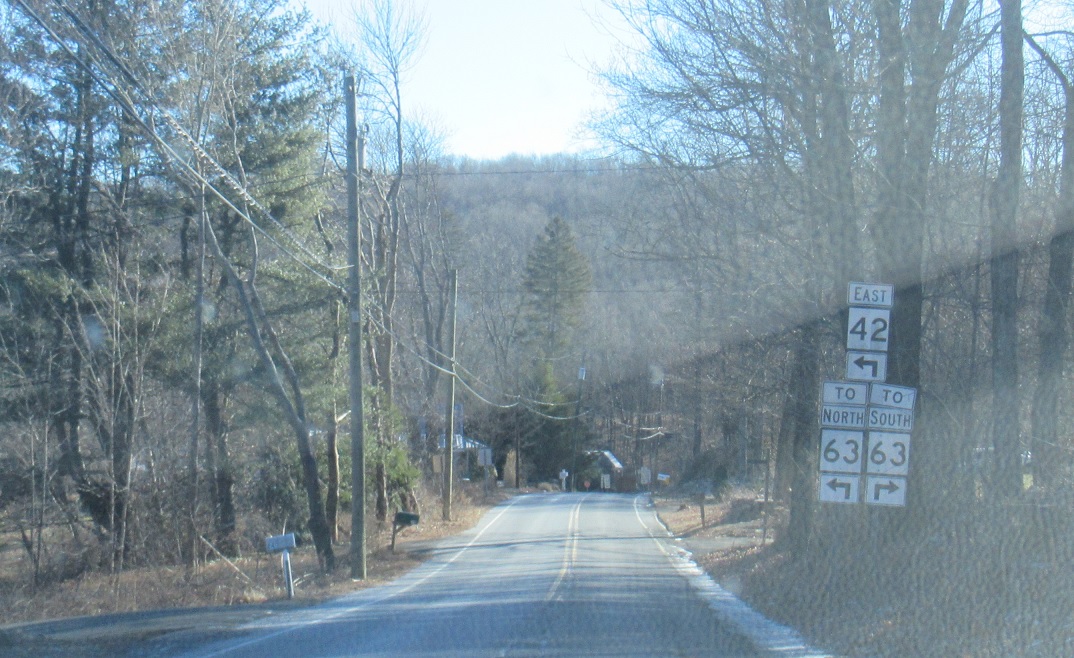 A couple miles later, we’ll approach SR 703, which is an old routing of CT 63. Turn right for SR 703 south to CT 63 south. Turn left for CT 42 east to CT 63 north.