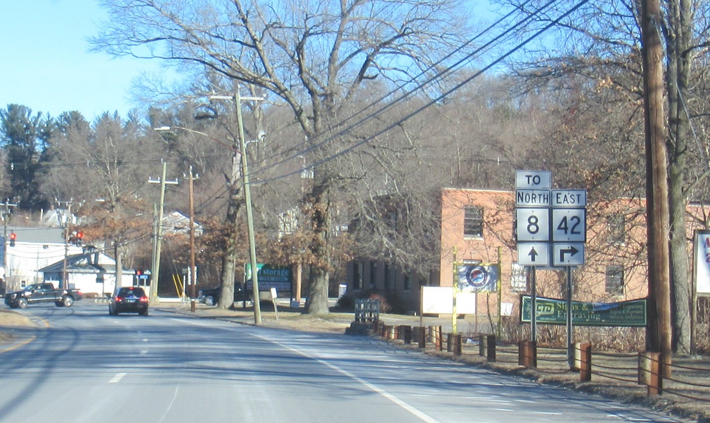 No reassurance shield after CT 8 as CT 42 jumps onto old CT 8 into downtown Beacon Falls.