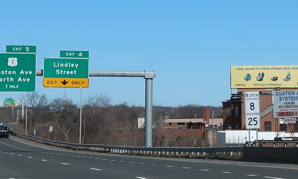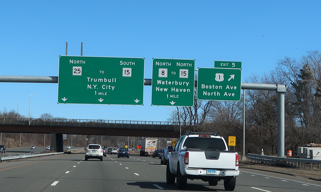 Exit for SR 722, which connects to US 1. Just ahead, CT 8 and 25 will split. Keep left for 25 north to CT 15/Merritt Pkwy south. Keep right for 8 north to 15/Merritt Pkwy south.