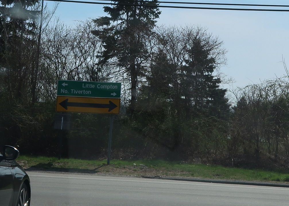 Soon thereafter, we’ll approach RI 77, denoted here with some lemgthy arrows. Turn left for 77 south to Little Compton and right for 77 north to North Tiverton. RI 177 ends.