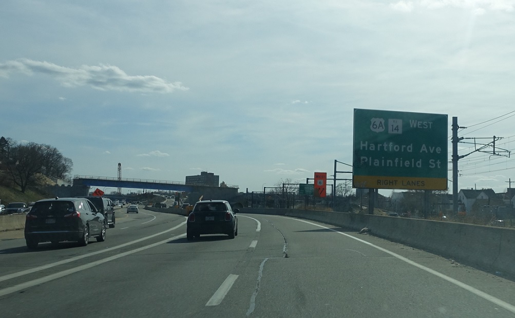 Exit right for US 6 west, with connections to US 6A and RI 14. Keep left for RI 10 south.
