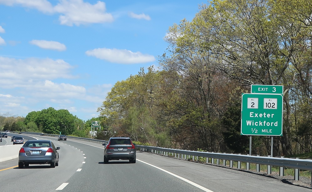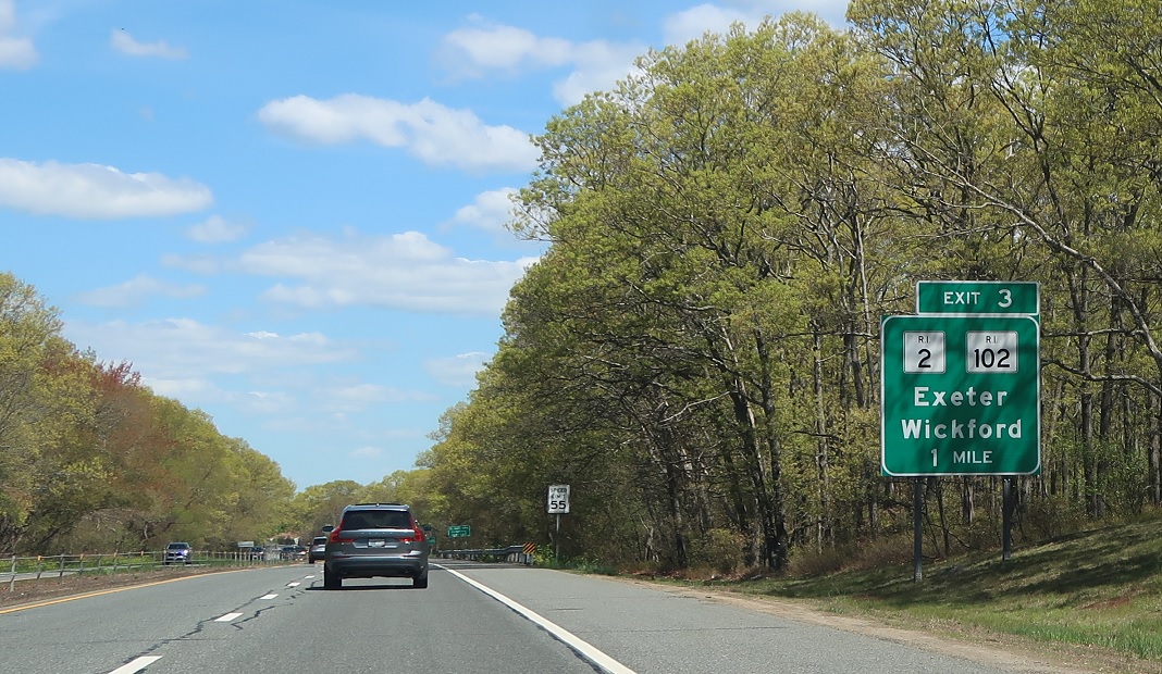 Exit for RI 2/102, with 102 heading south to Wickford and north to Exeter. RI 2 generally parallels RI 4, which turns into a full freeway from here to I-95.