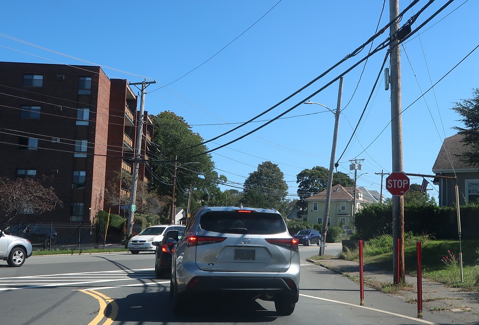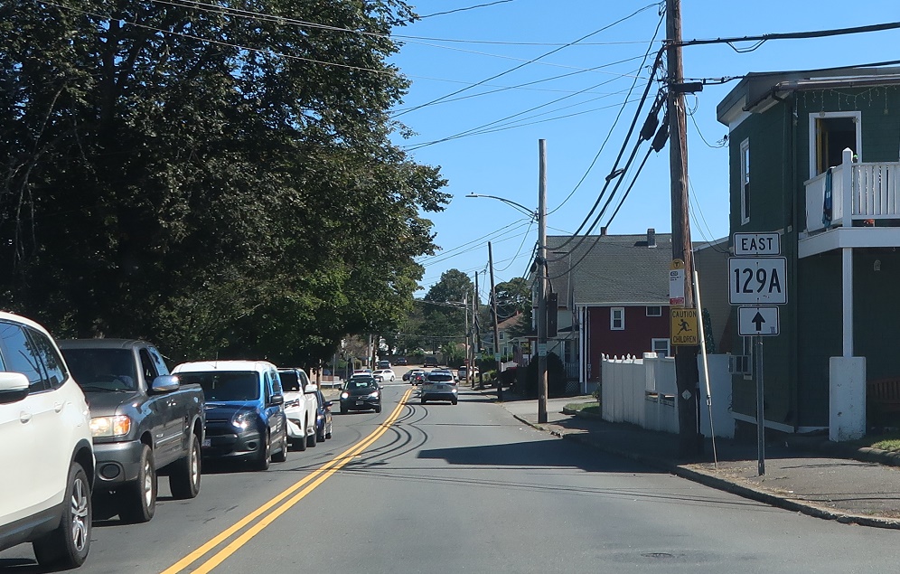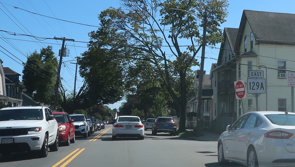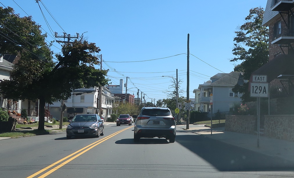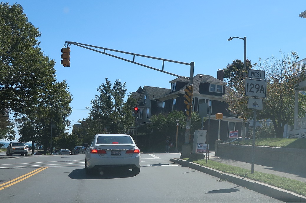 This sign is all sorts of wrong – we’re at the Route 1A/129 junction. Stay straight to stay on regular 129 east, not 129A west. Turn right for 1A south and 129 west. Turn left for 1A north. Route 129A ends.
