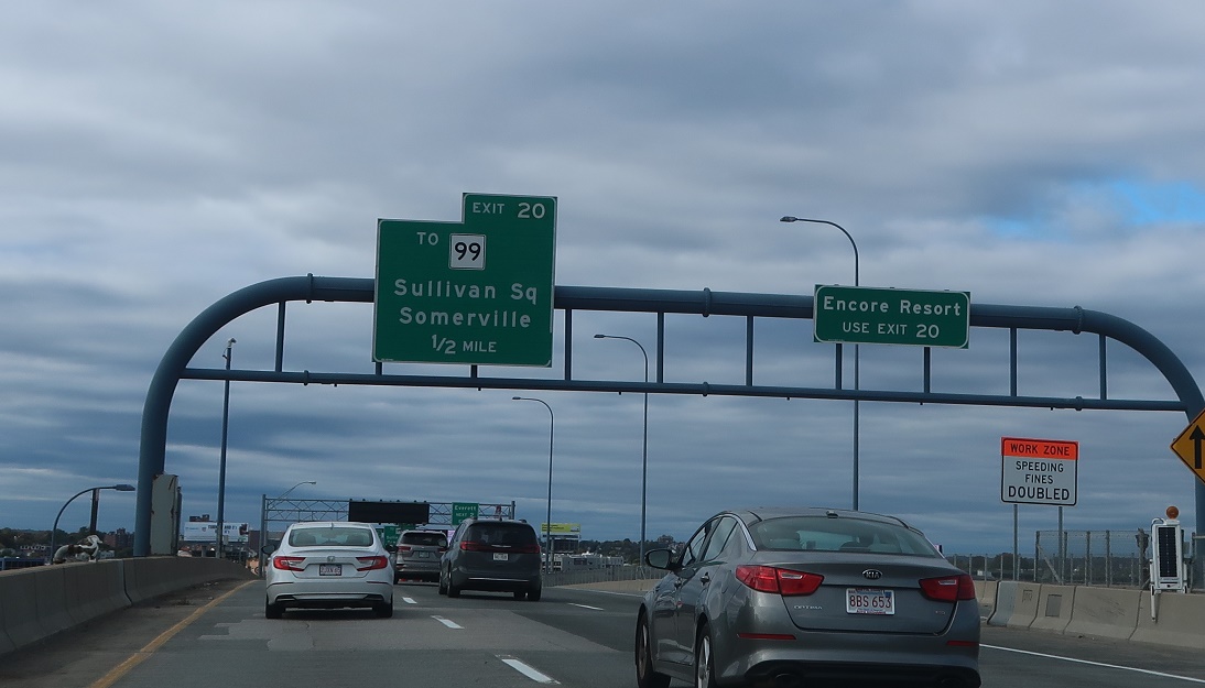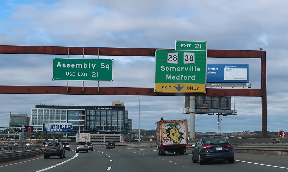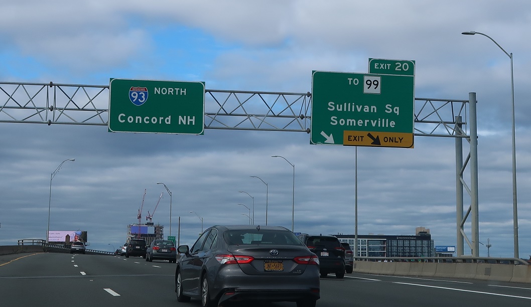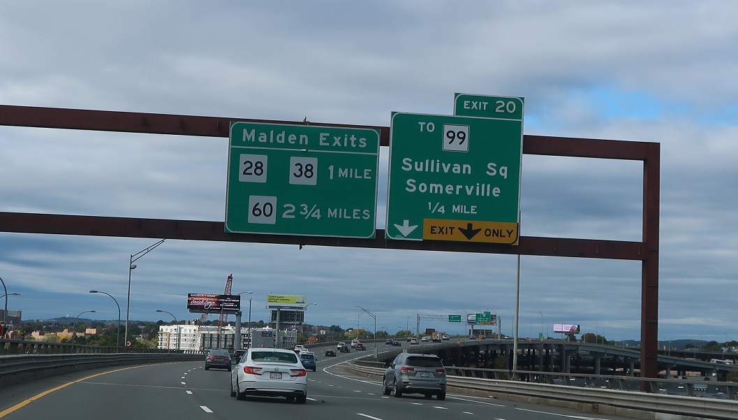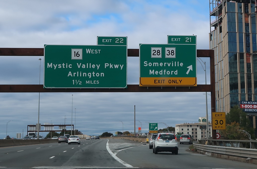 Exit for Routes 28 and 38. 28 crosses 93 diagonally, and heads southwest and northeast from here. This is the southern terminus of Route 38, which will parallel I-93 for several miles.
