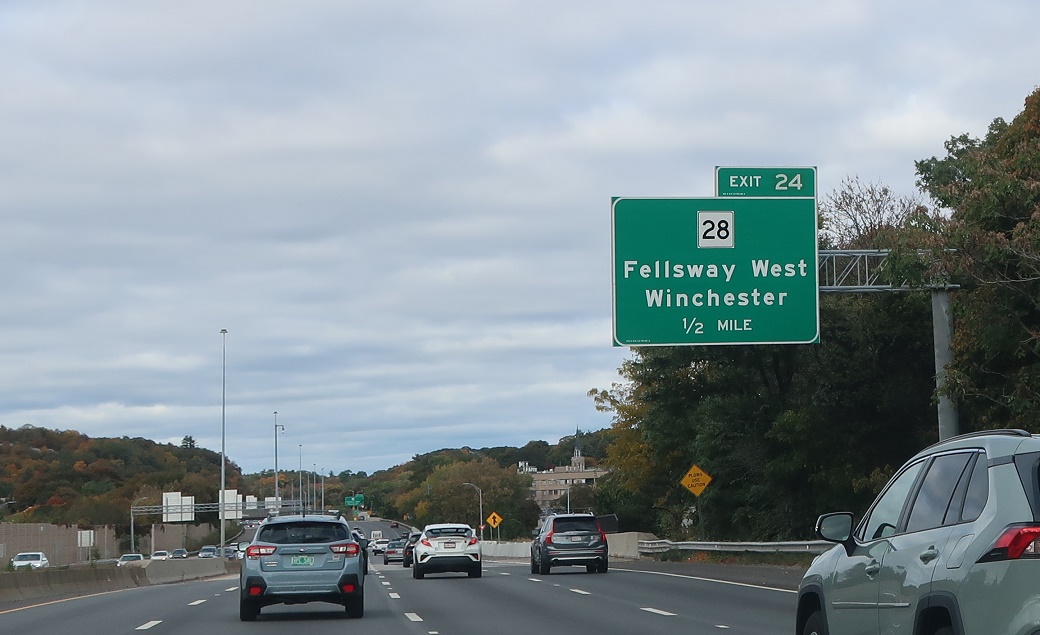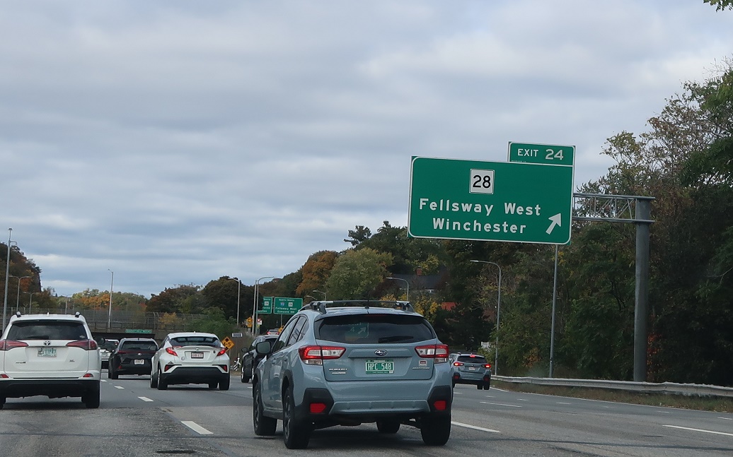 Exit for Route 28, which follows the Fellsway through the Middlesex Fells parkland.