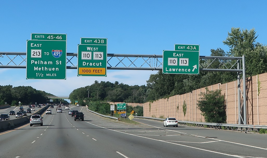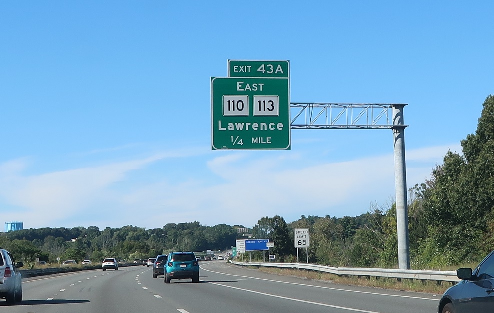 Exit for 110/113 east to Lawrence. Exit just ahead for 110/113 west. We’re 1.5 miles from the Route 213 Loop Connector to I-495.