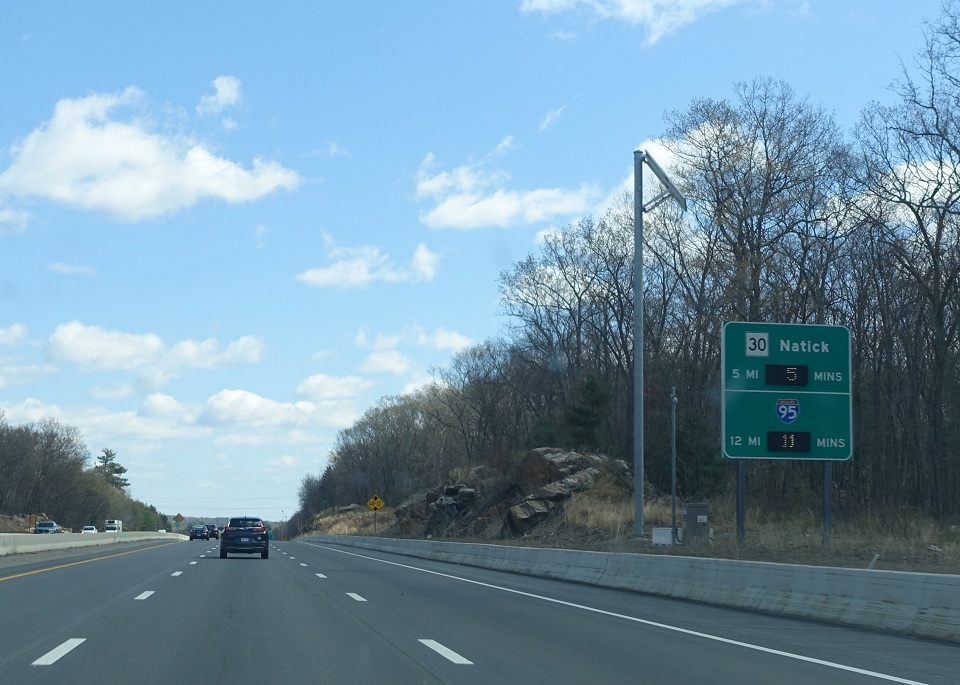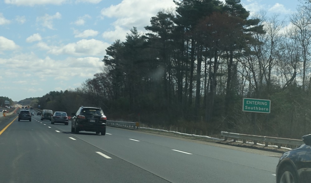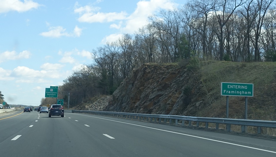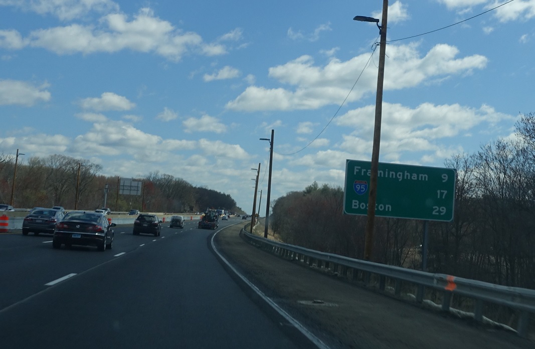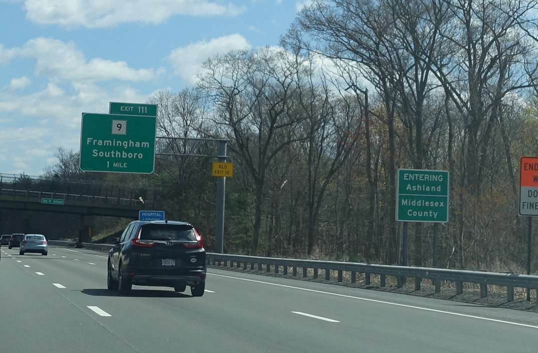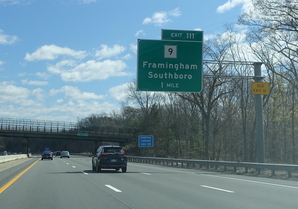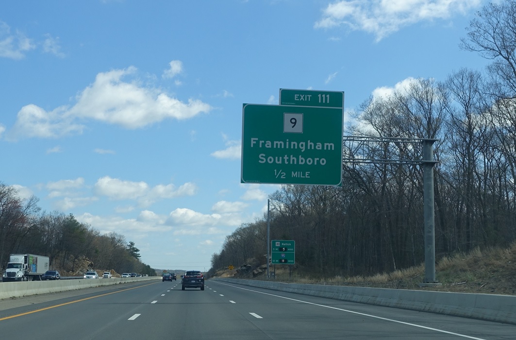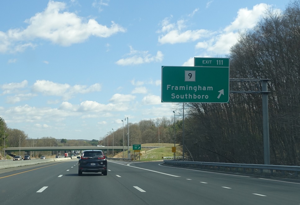 Exit for Route 9, which heads west to Southborough center and east to Framingham center.