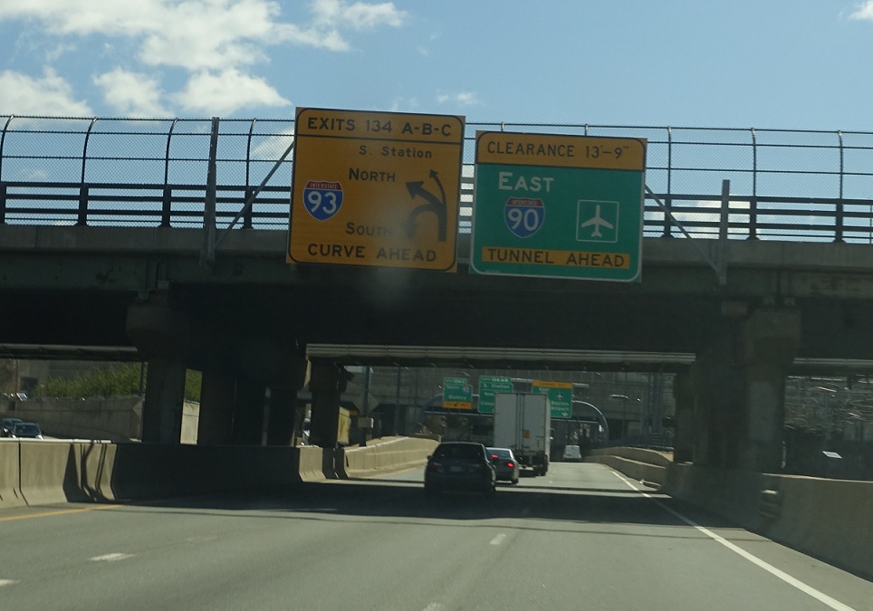 Exit left for I-93 north (as well as unsigned US-1, MA 3, and MA 3A north). Keep left for I-93 south (as well as unsigned US-1, MA 1A, MA 3, and MA 3A south). Route 1A north will join I-90 east through the Ted Williams tunnel – a recent change as 1A used to use the Sumner/Callahan tunnels.