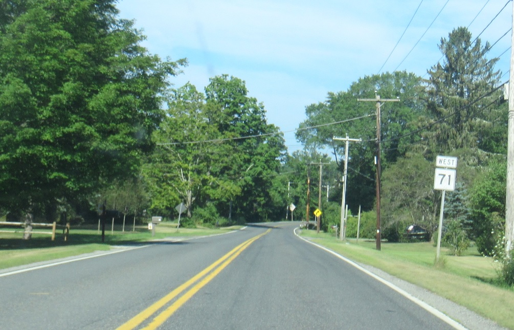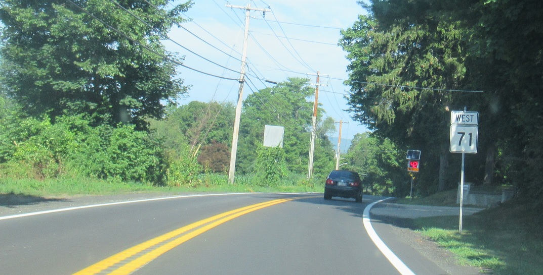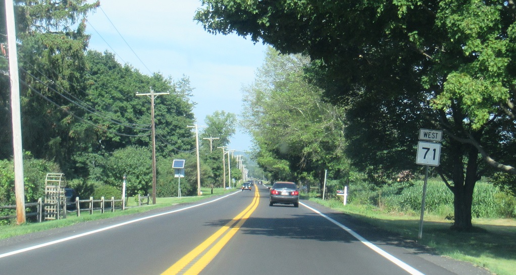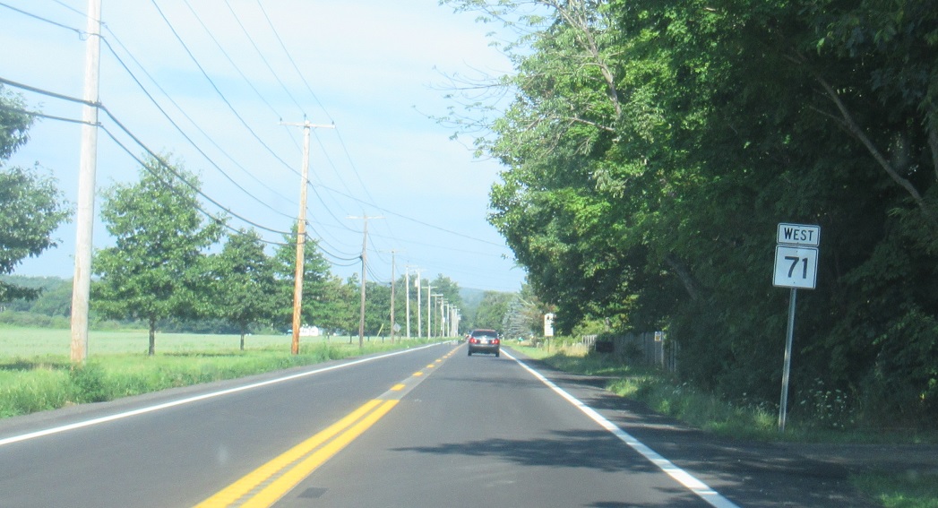 Welcome to New York! Route 71 turns into New York Touring Route 71 and continues up to Route 22.