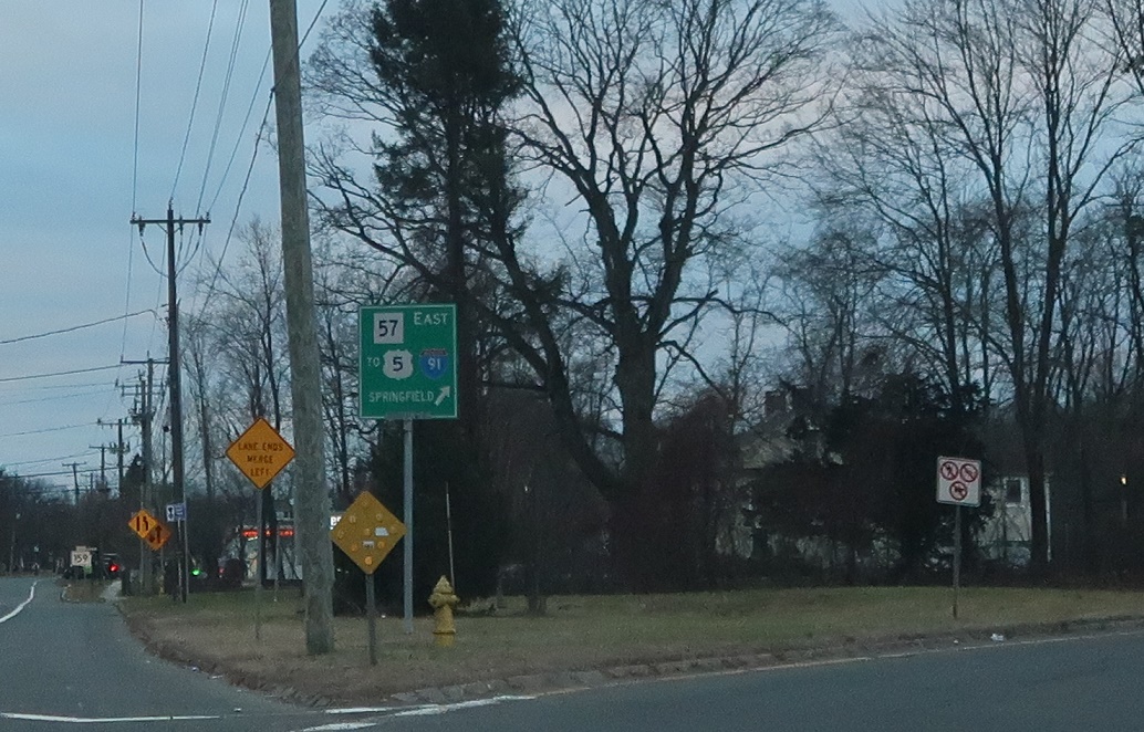 A mile later, we’ll approach Route 57. There is no access to 57 west from 159 south – Route 75 makes that connection. Keep right ahead for 57 east to U.S. 5 and I-91.