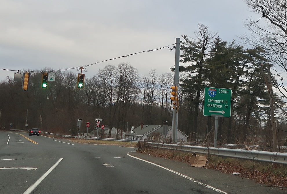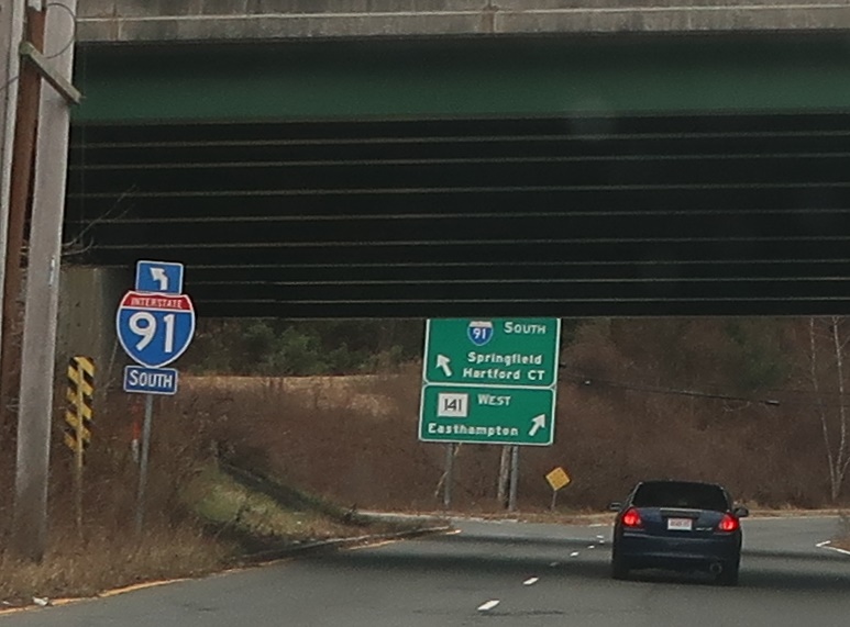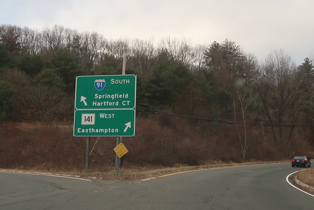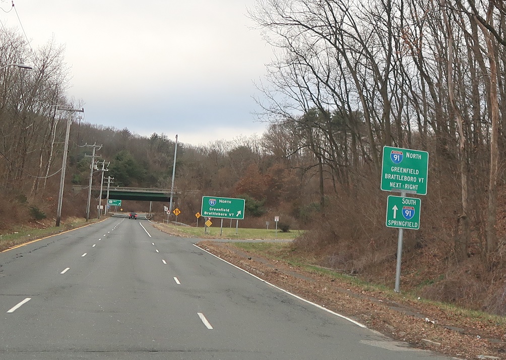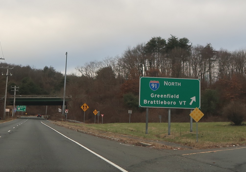 Exit right for I-91 north to Greenfield and Brattleboro, Vt.