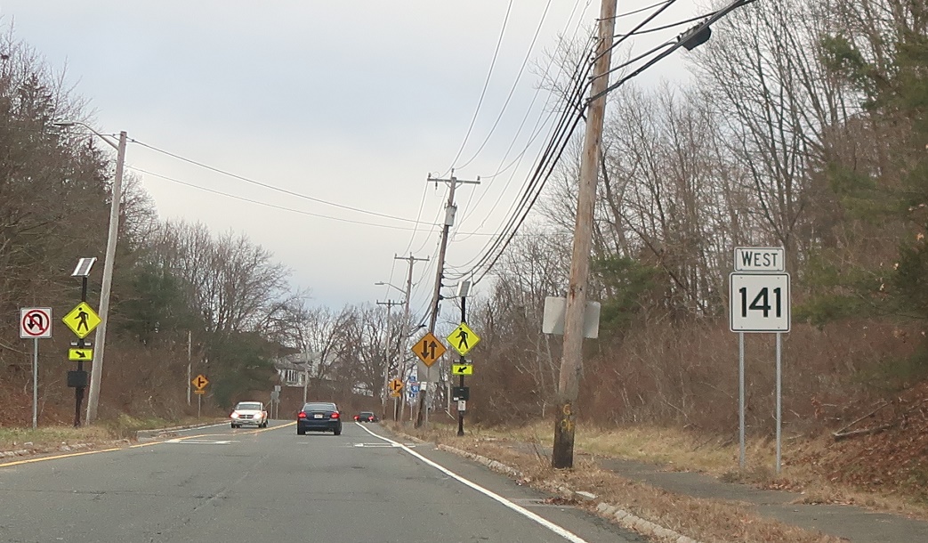 Exit left ahead for I-91 south. This is a weird interchange because it’s broken up into two parts, but there are actually two ramps to I-91 south from 141 west. There is only one ramp to 91 south from 141 east, which we’ll approach ahead. All other movements have one ramp.