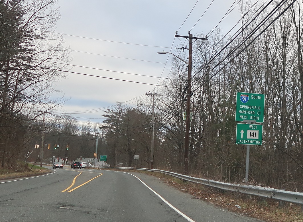 Turn right ahead for I-91 south – with this ramp serving 141 east and 141 west. Stay straight to stay on 141 west.