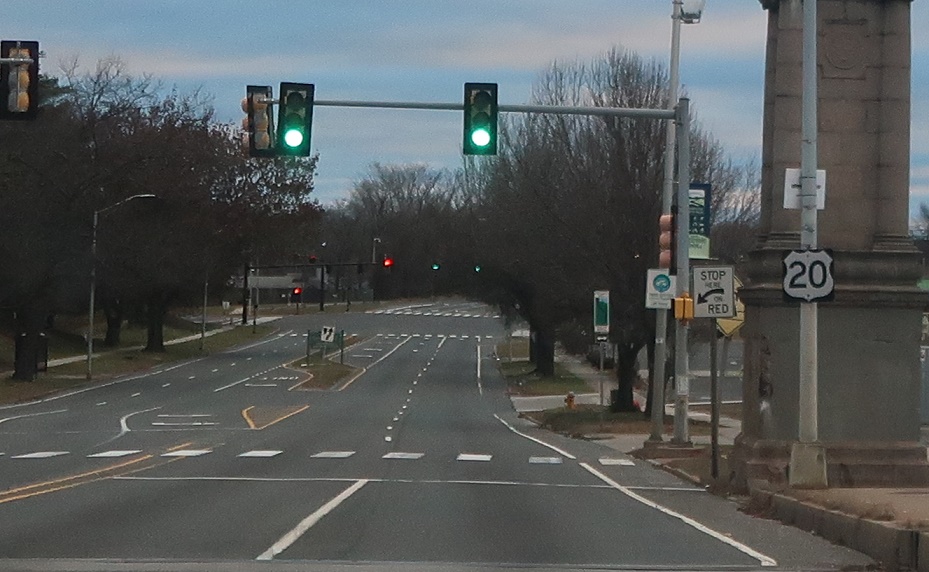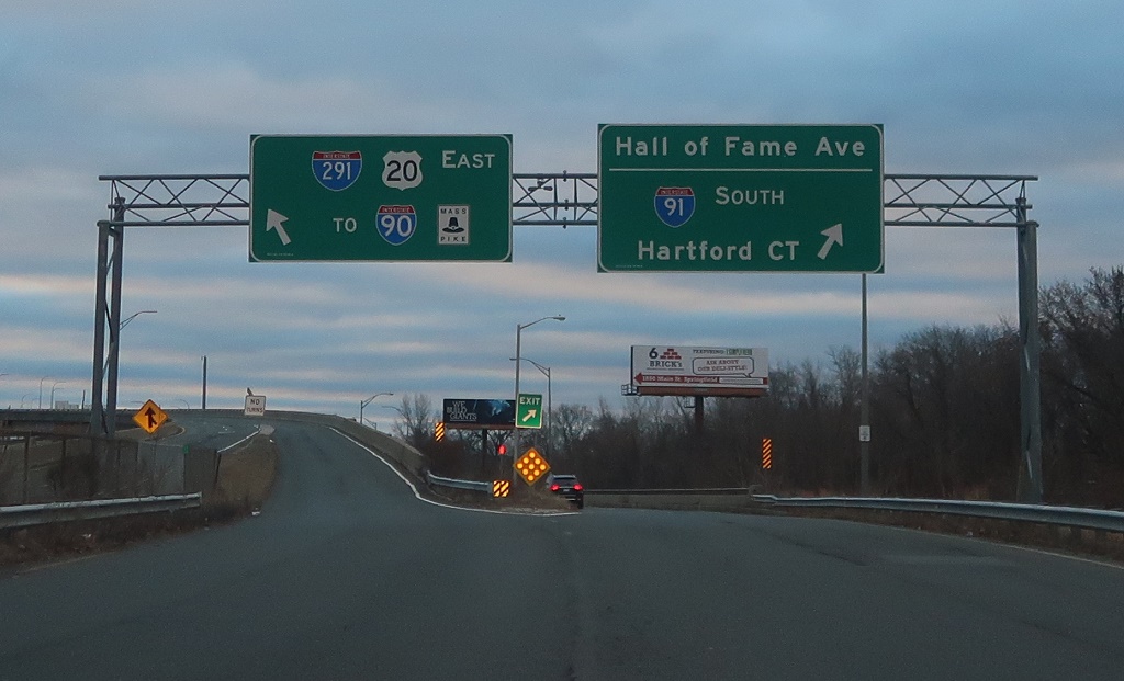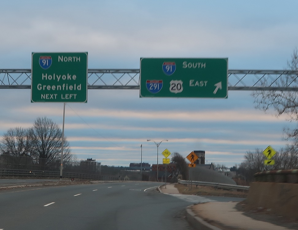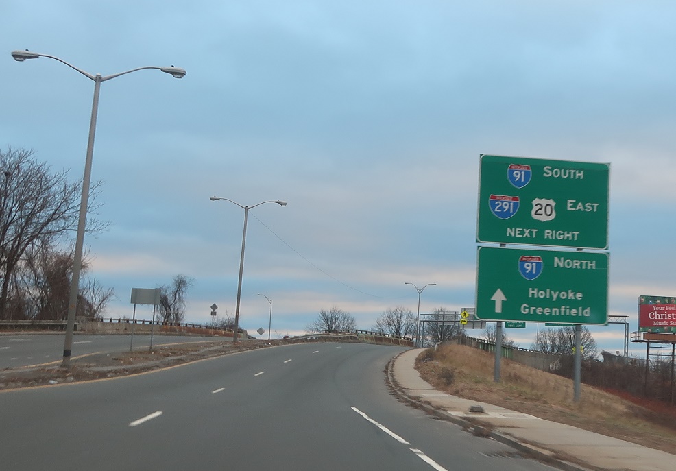 Exit right for I-91 south to Connecticut. U.S. 20 east will briefly join I-291 as I-291 heads towards the Mass. Pike.