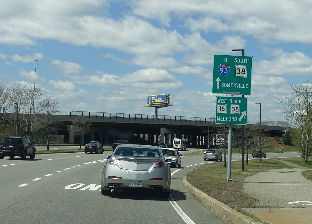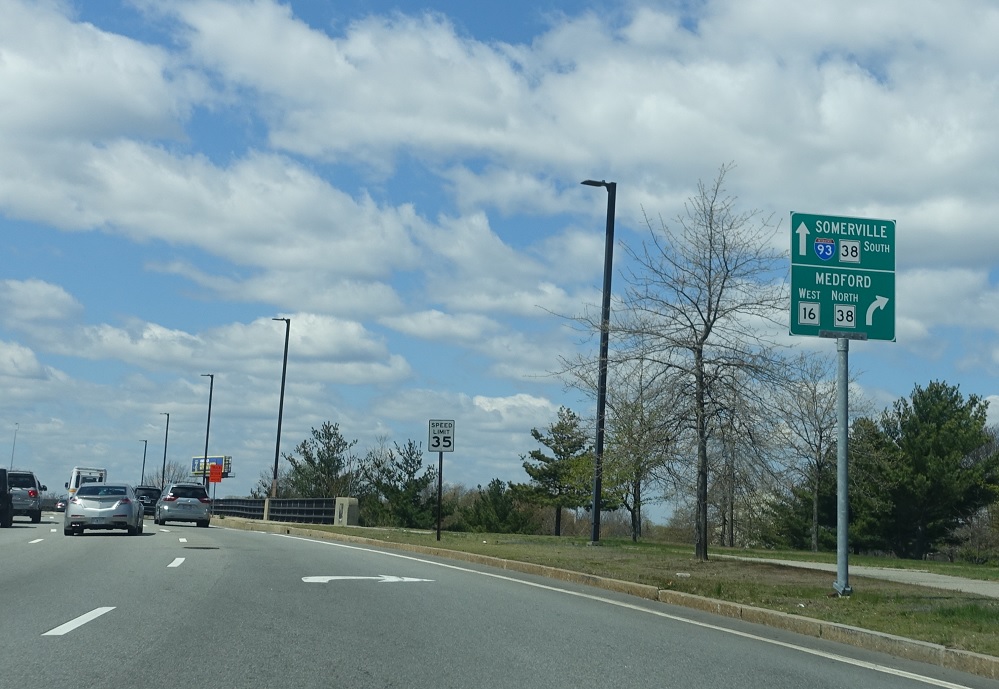 Stay straight ahead to follow an unnumbered connection to Route 38 south and the ramps to I-93. Keep right for 16 west with direct connections to 93 north and 38 north.