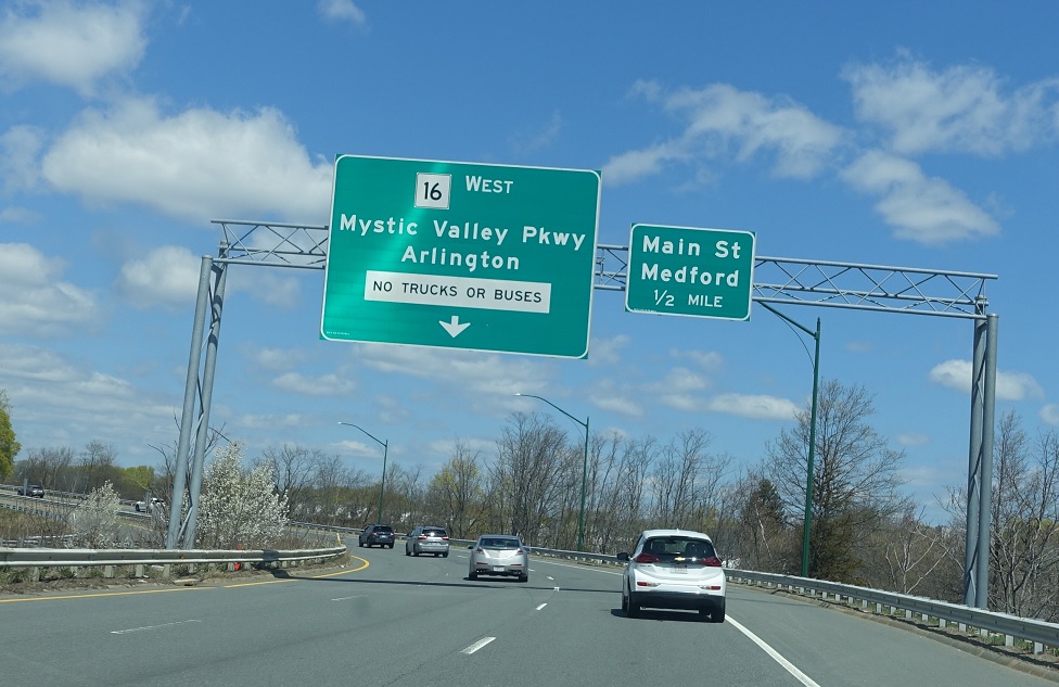 Overhead reassurance shield after the turn – the Mystic Valley Parkway prohibits trucks and buses. Traffic from I-93 north merges on from the ramp on the left.