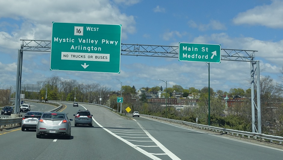 Just after I-93 traffic merges on, exit for Medford Main Street, which is Route 38 south. 38 north briefly joins 16 west.