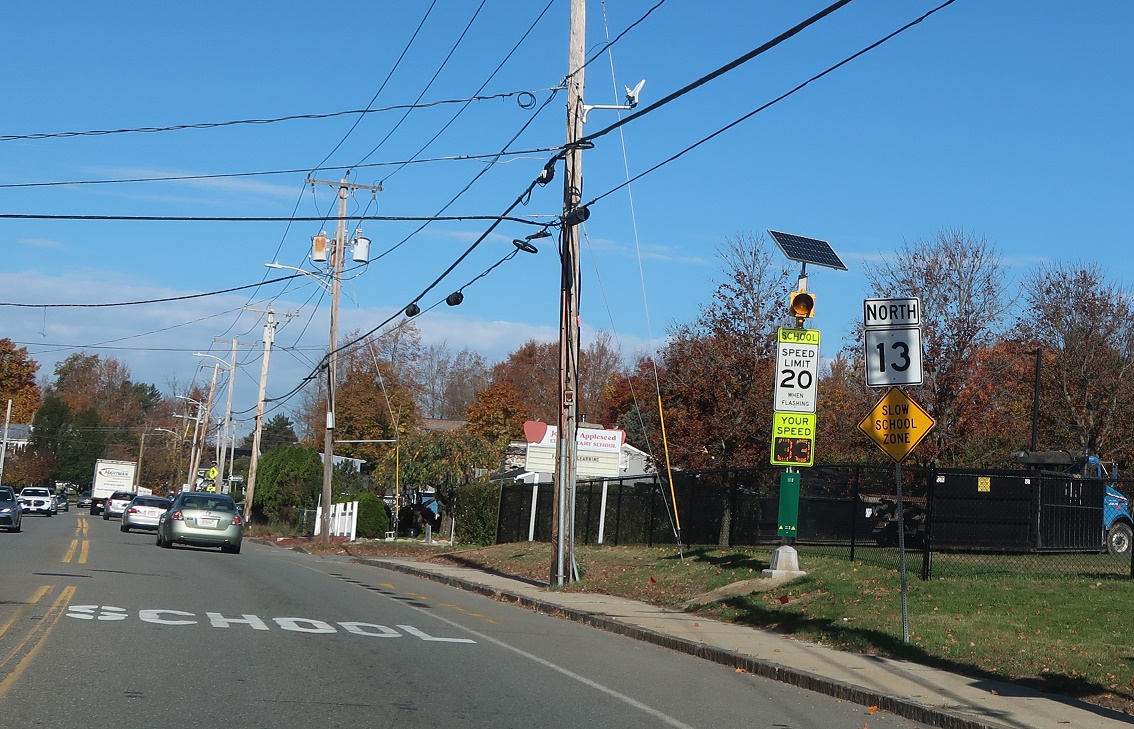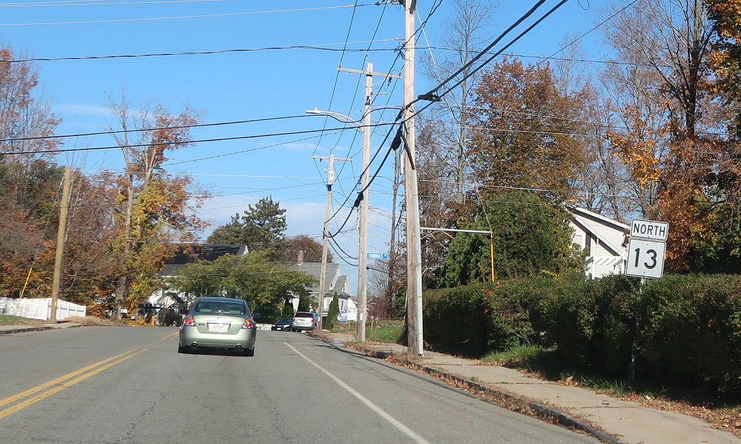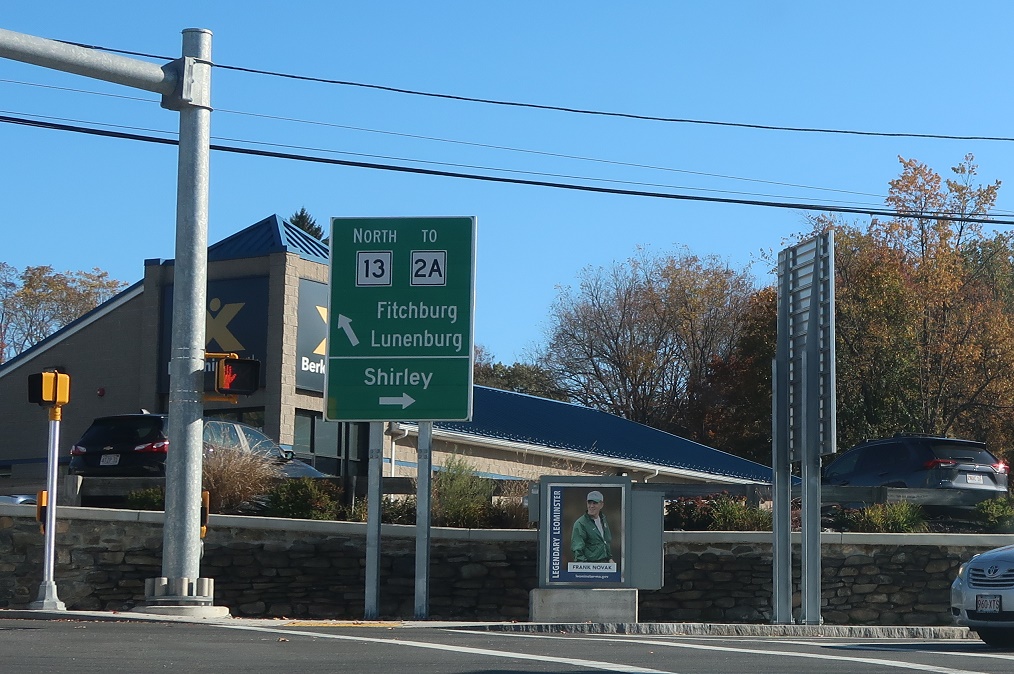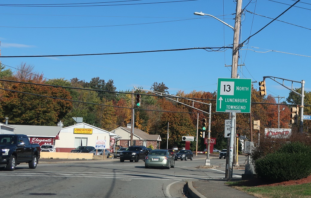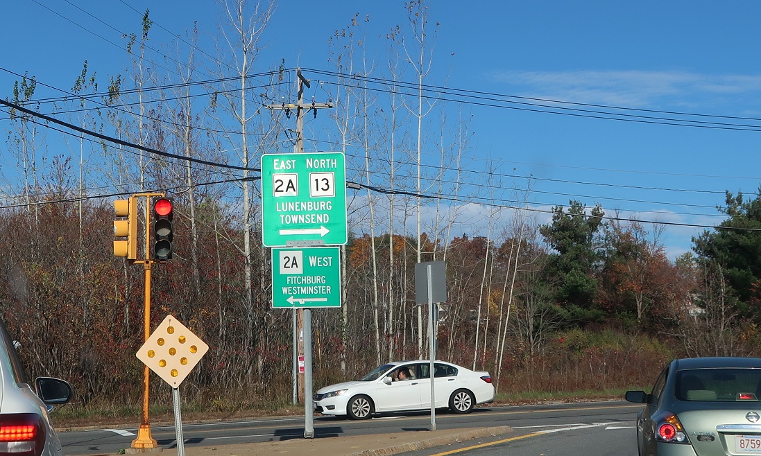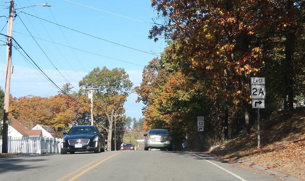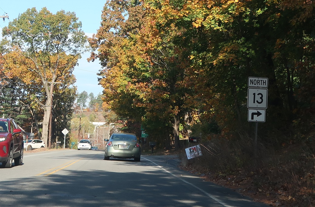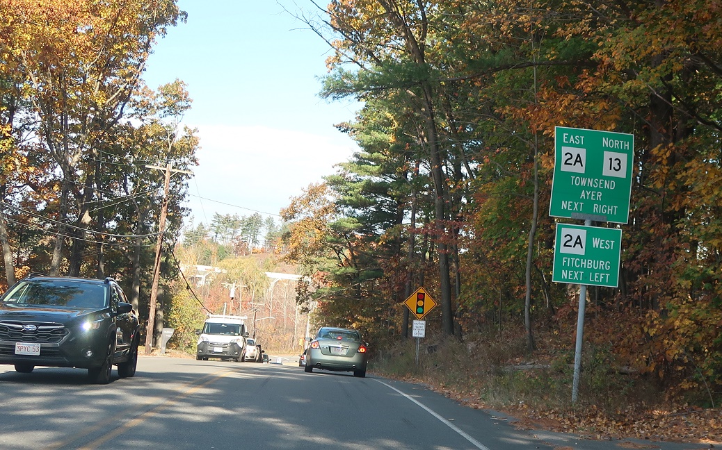 We’re still a ways from Route 2A, but keep left for 13 north to 2A. Turn right for Shirley.