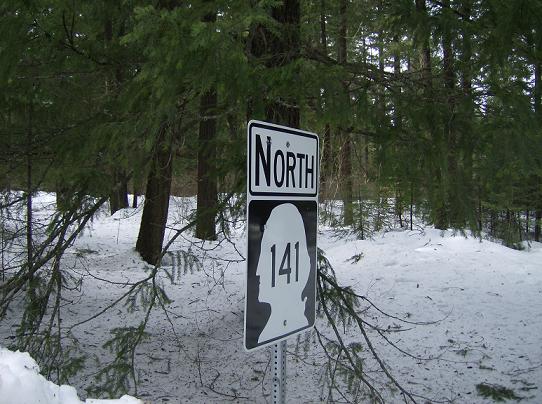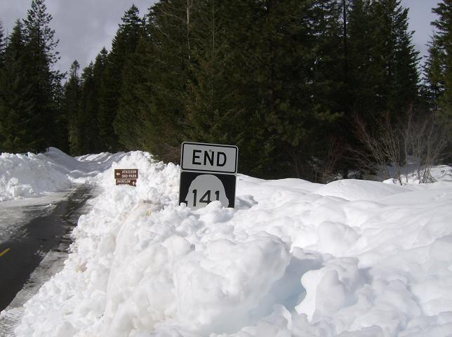 SR 141 ends at the Skamania Cty Line at a snow park lot and the Gifford-Pinchot NF boundary. Climbed up to get this END sign