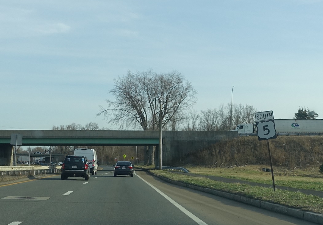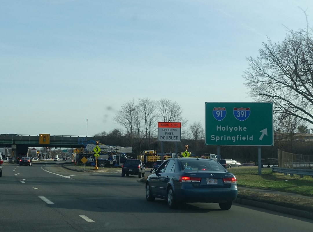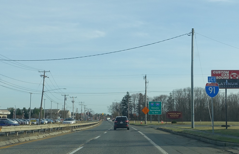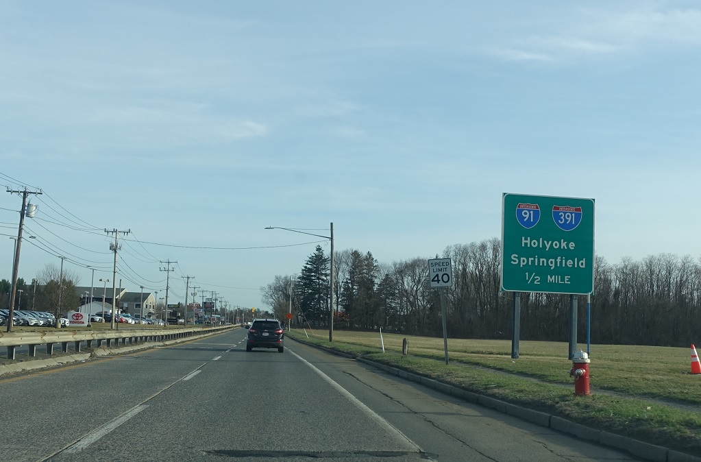 Exit right for I-91 in both directions via an unusual interchange. I-91 south quickly connects to I-391.