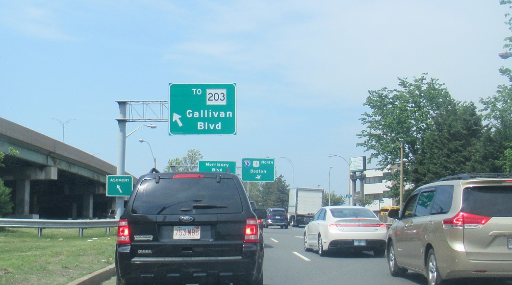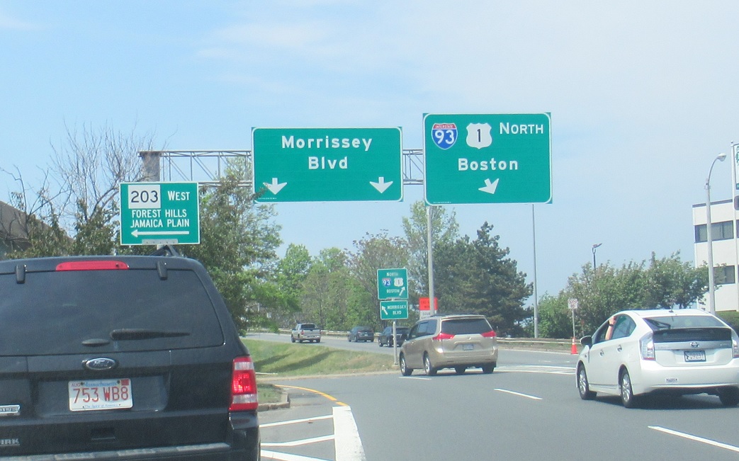Keep left for Route 203. Keep right for I-93/US-1, which also carries Route 3 and silent Routes 1A and 3A – so Route 3A will merge onto I-93 here, and will remain quiet (though very much on the books) all the way to the other side of the 128 corridor.