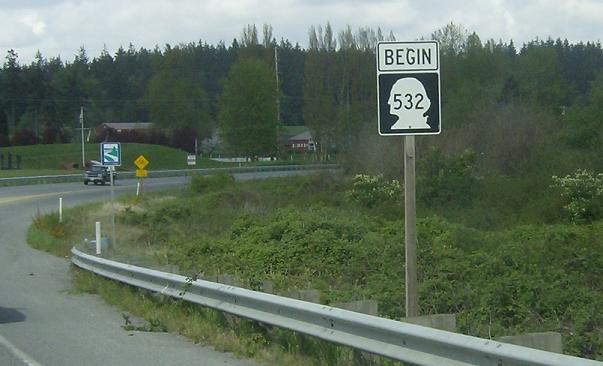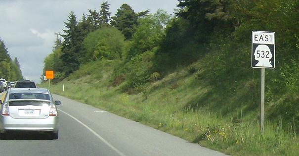 SR 532 begins, heads as a partially controlled access two lane road back to I-5