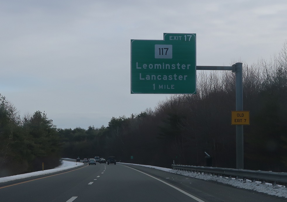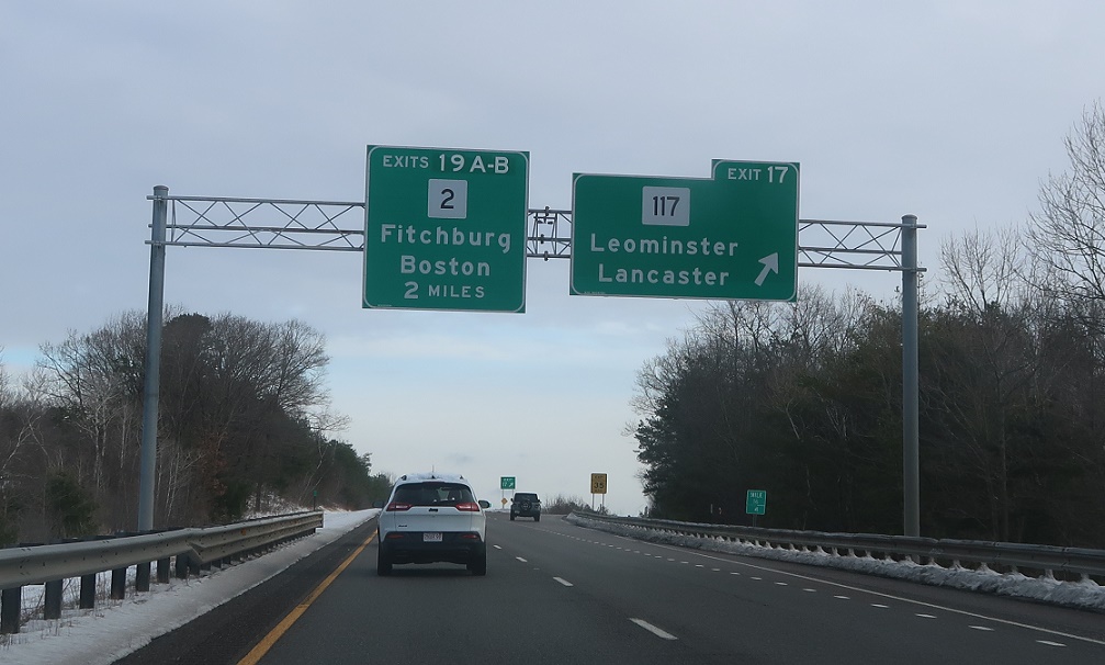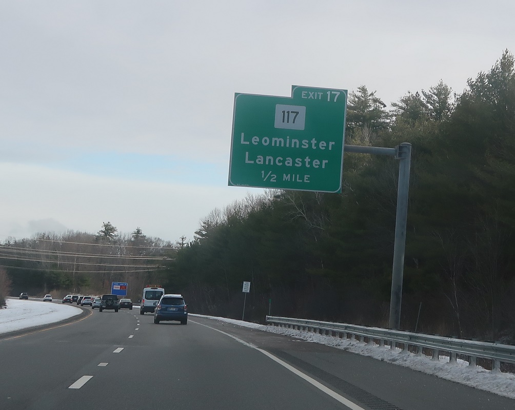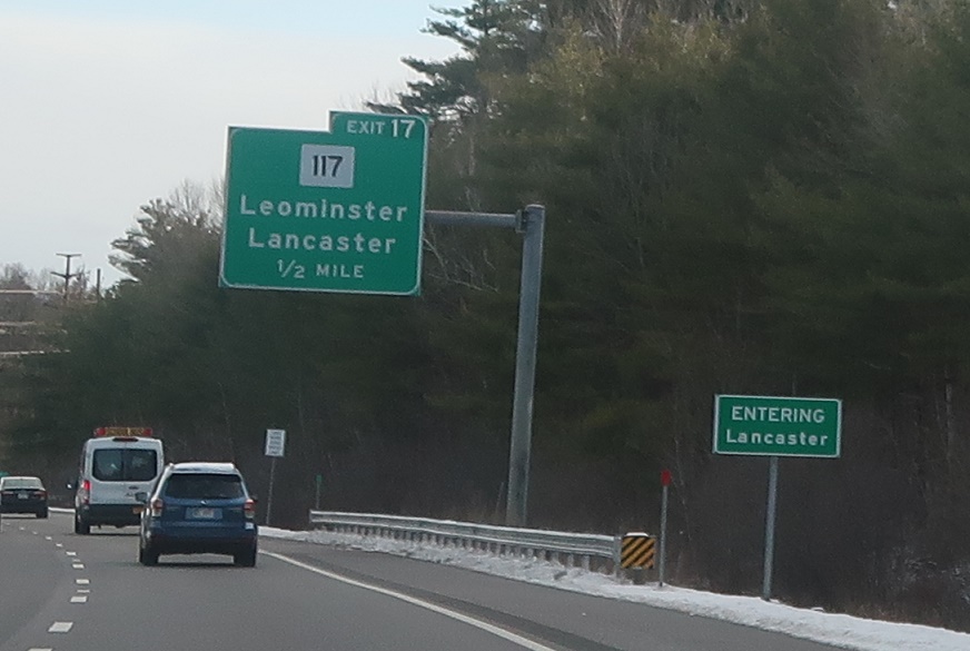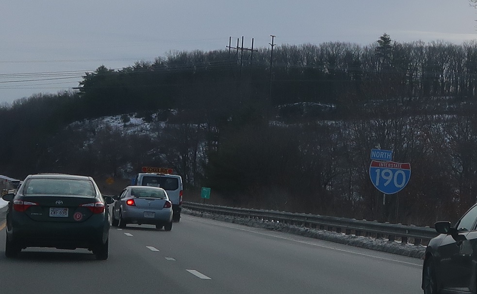 Exit for Route 117, which heads west into downtown Leominster and east to Lancaster center. In two miles we’ll approach I-190’s northern terminus at Route 2.
