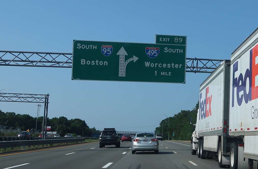 In a mile, we’ll approach I-495, which is the outer bypass around the Boston area. Up ahead, traffic from Route 286 will merge on – there is no direct access to 286 from I-95 south, but a ramp that began in New Hampshire carries traffic towards it.