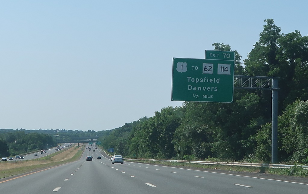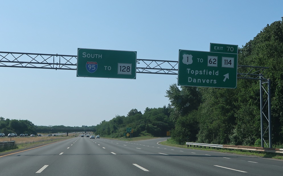 Exit for U.S. 1 with service to Routes 62 and 114. Keep left for I-95 south to Route 128.