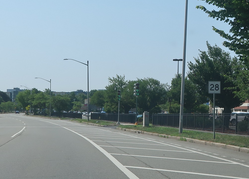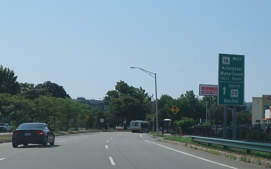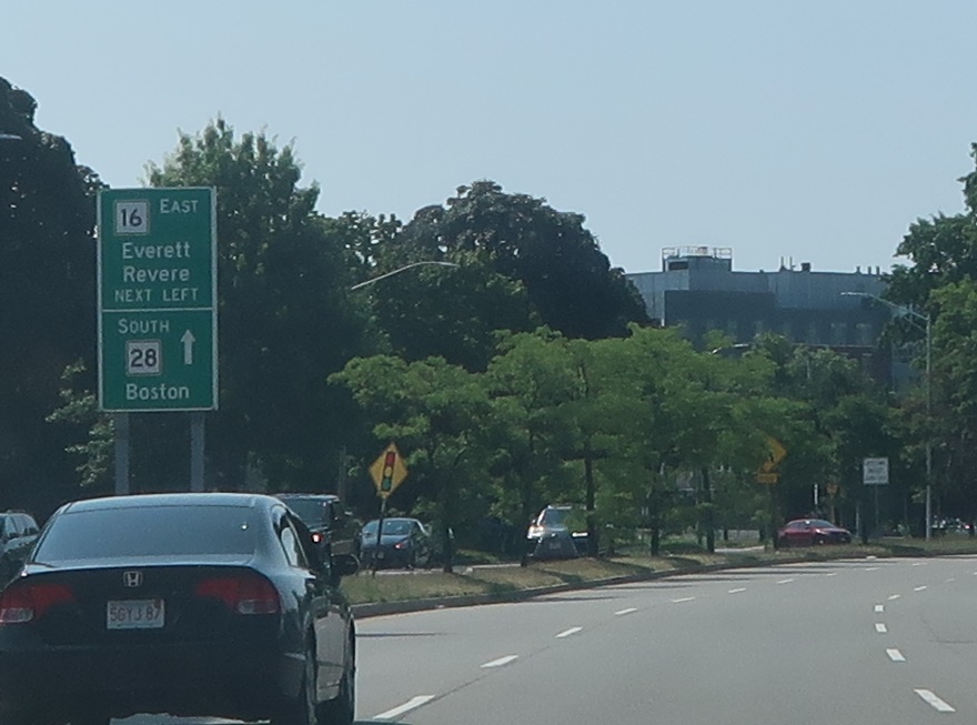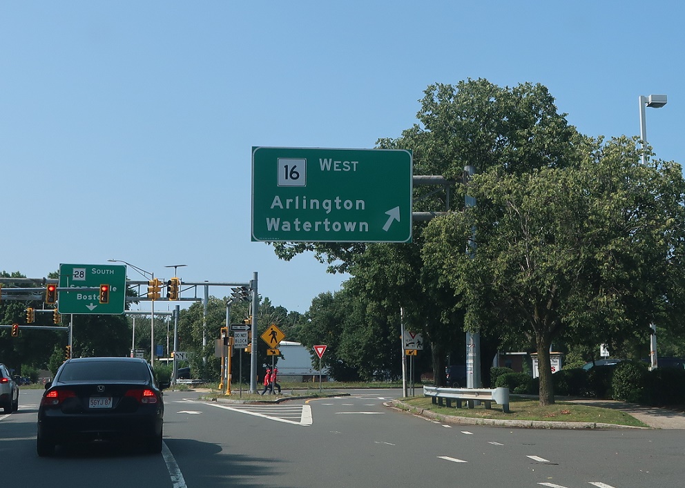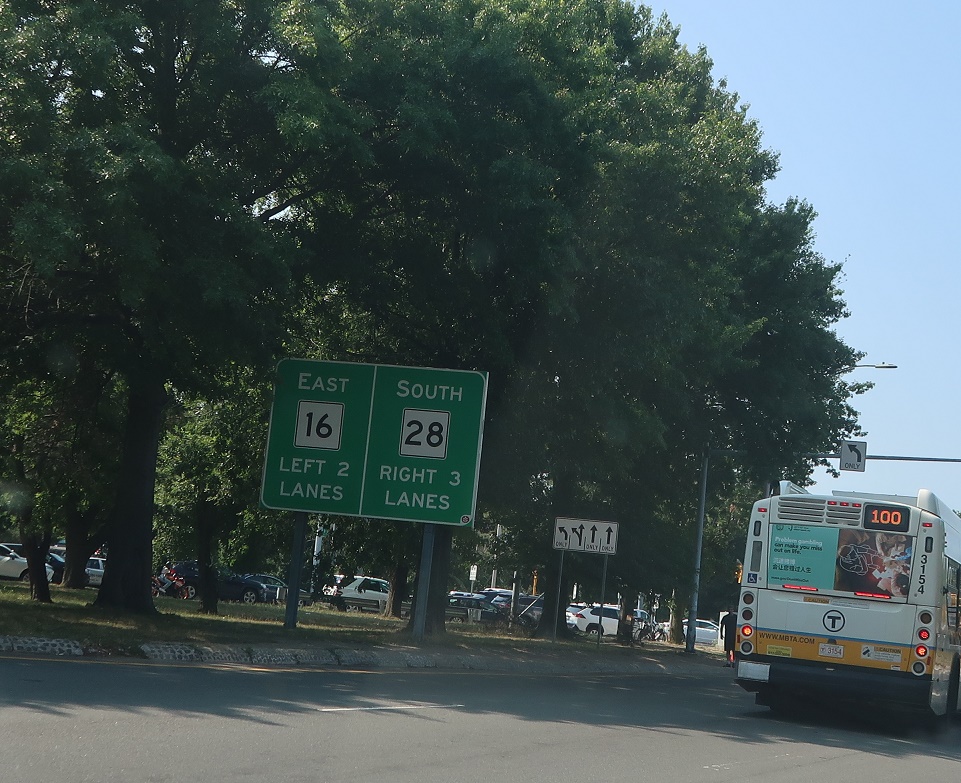 At one of the larger intersections in Massachusetts, keep left for 16 east and right for 28 south.