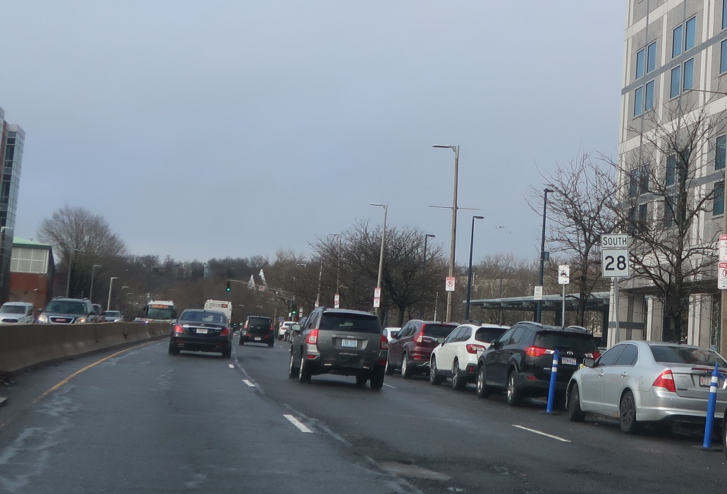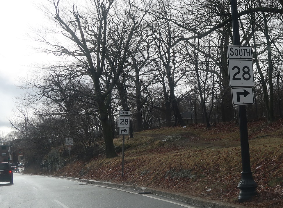 As we pass over the Mass. Pike, Route 28 will prepare to turn right.