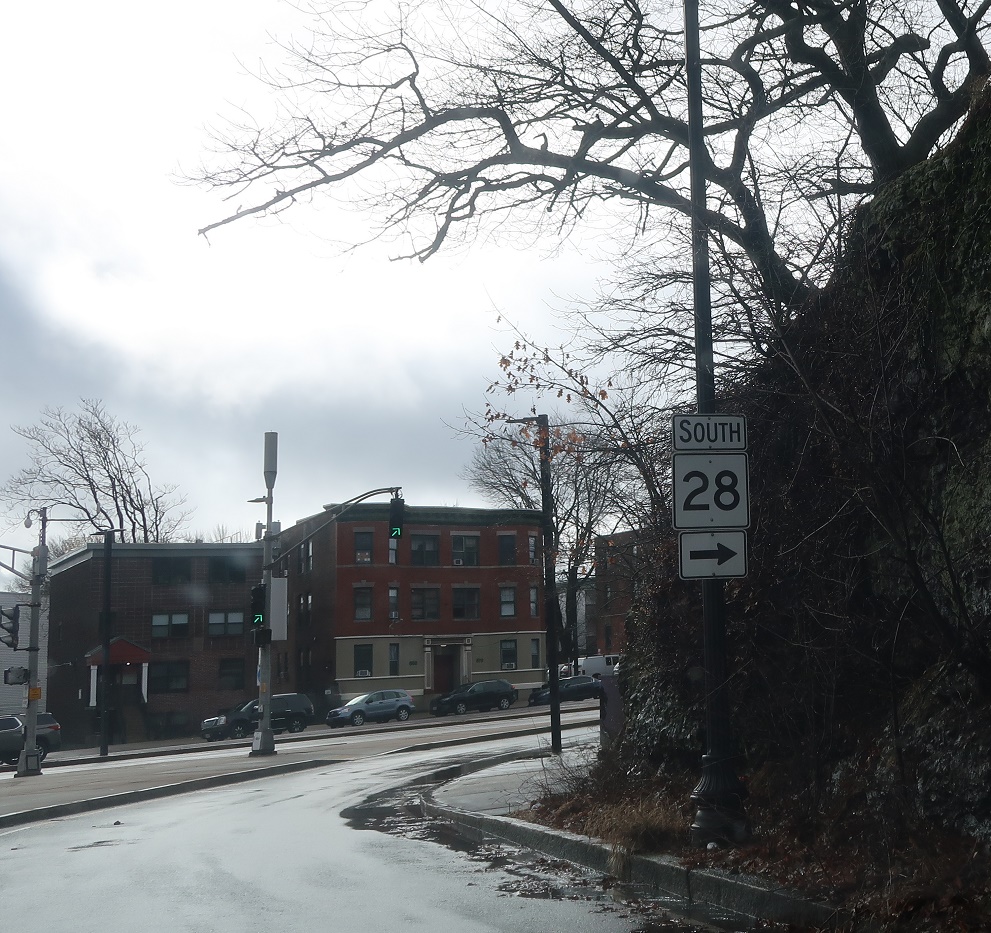 Reassurance shield a mile later. At the light in the background, we’ll come to an unsigned junction with Route 203. Turn left for 203 east. Turn right for 203 west to Jamaica Plain. Stay straight to stay on 28 south.