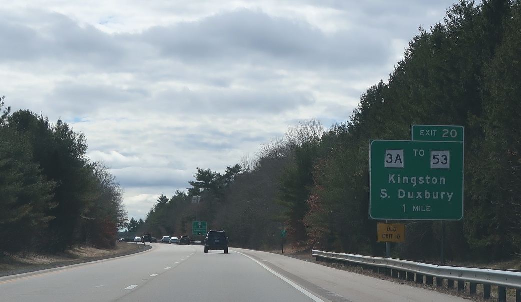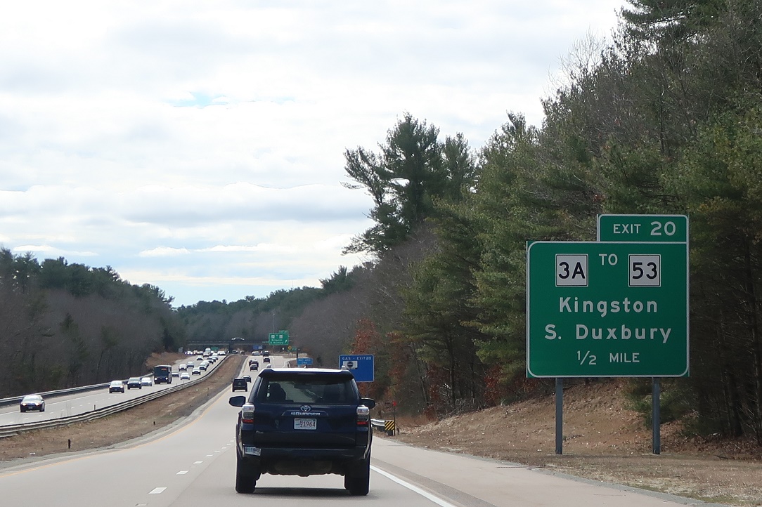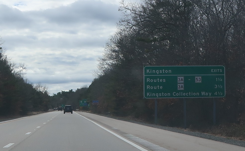 Up ahead, we’ll approach three interchanges that serve Kingston. Two intersect with Route 3A, with the first one providing a connection to Route 53.