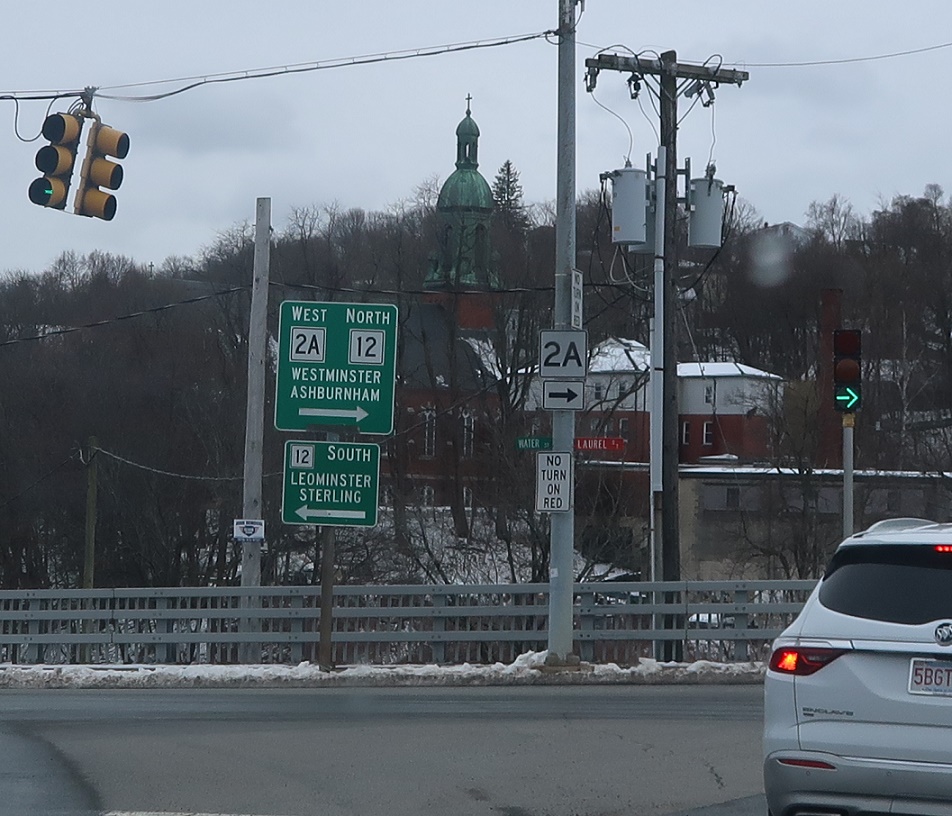After crossing the railroad tracks, we’ll approach Route 12. Turn left for 12 south. Turn right for 12 north, which 2A west will join through town.