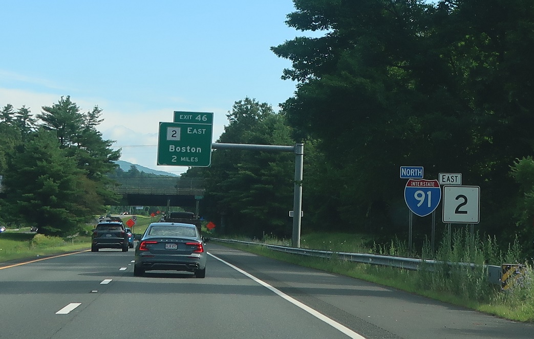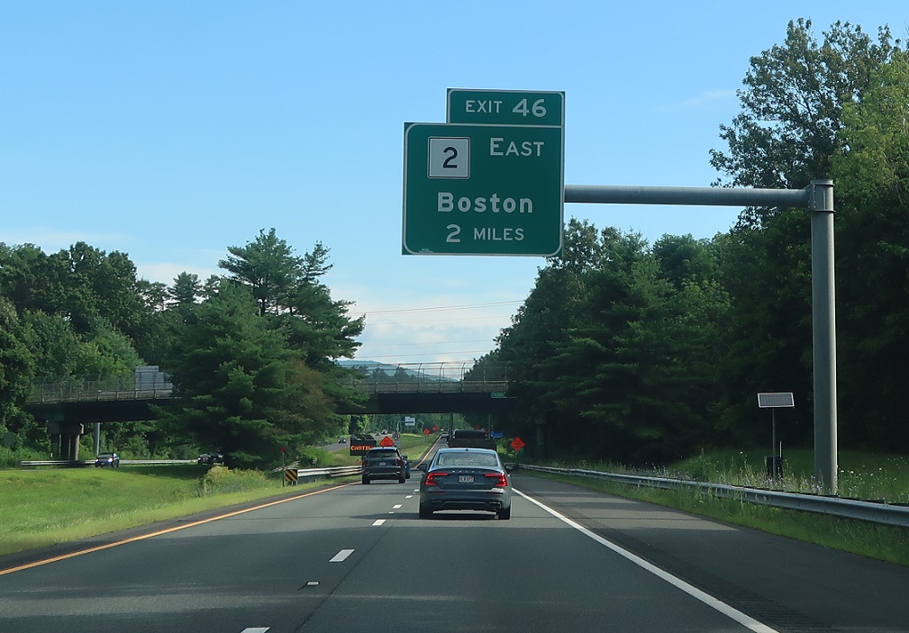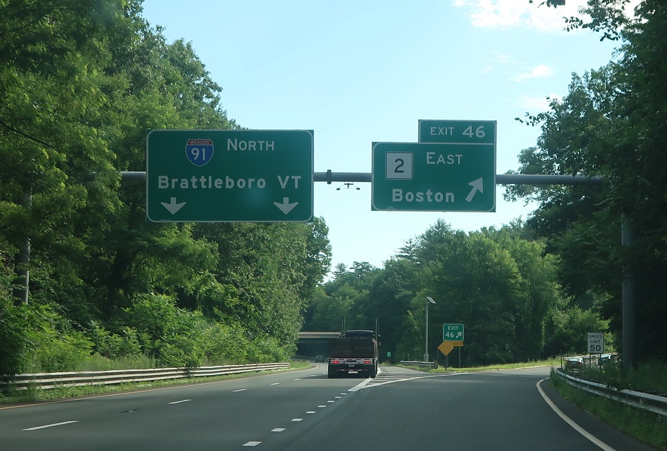 Exit for Route 2 east to Boston. Keep left for I-91 north to Vermont.