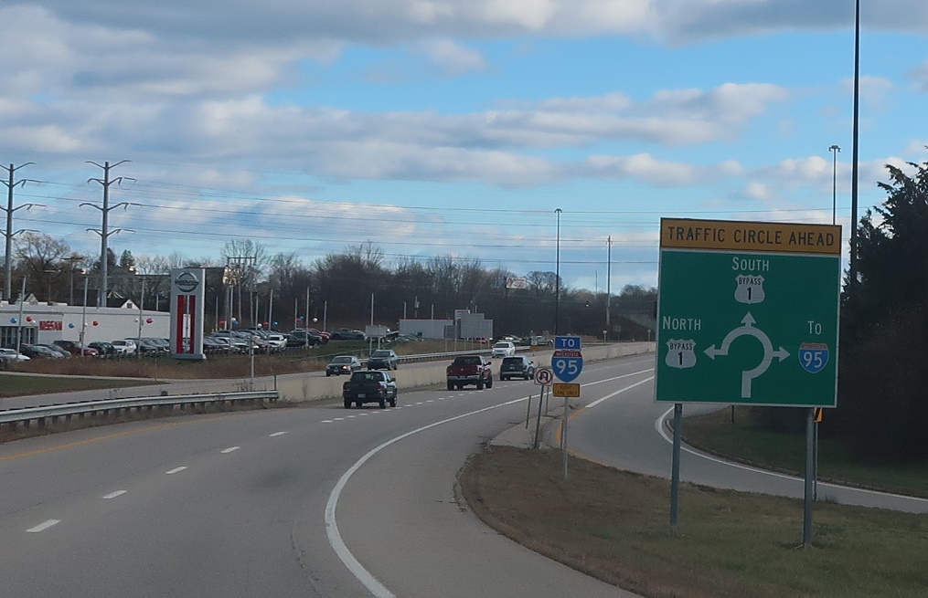 As we pass the I-95 south ramp, we’ll come down to a roundabout at the south end of the turnpike.