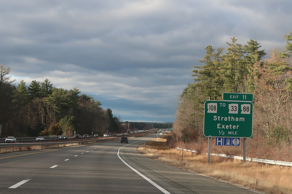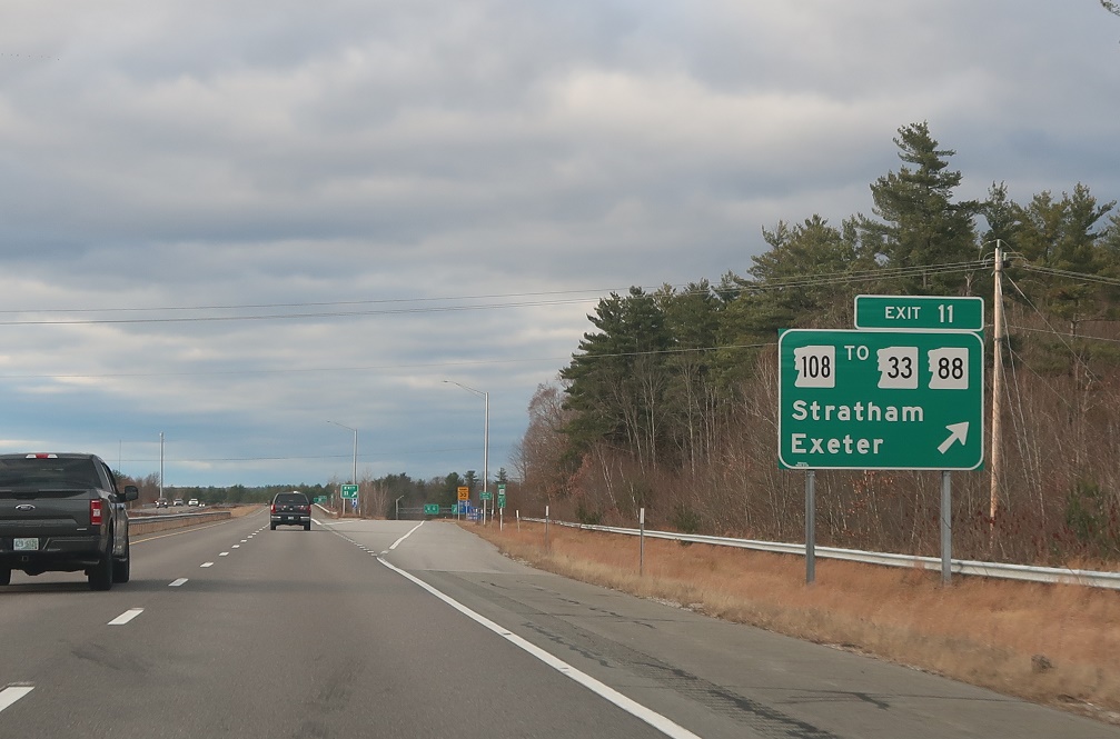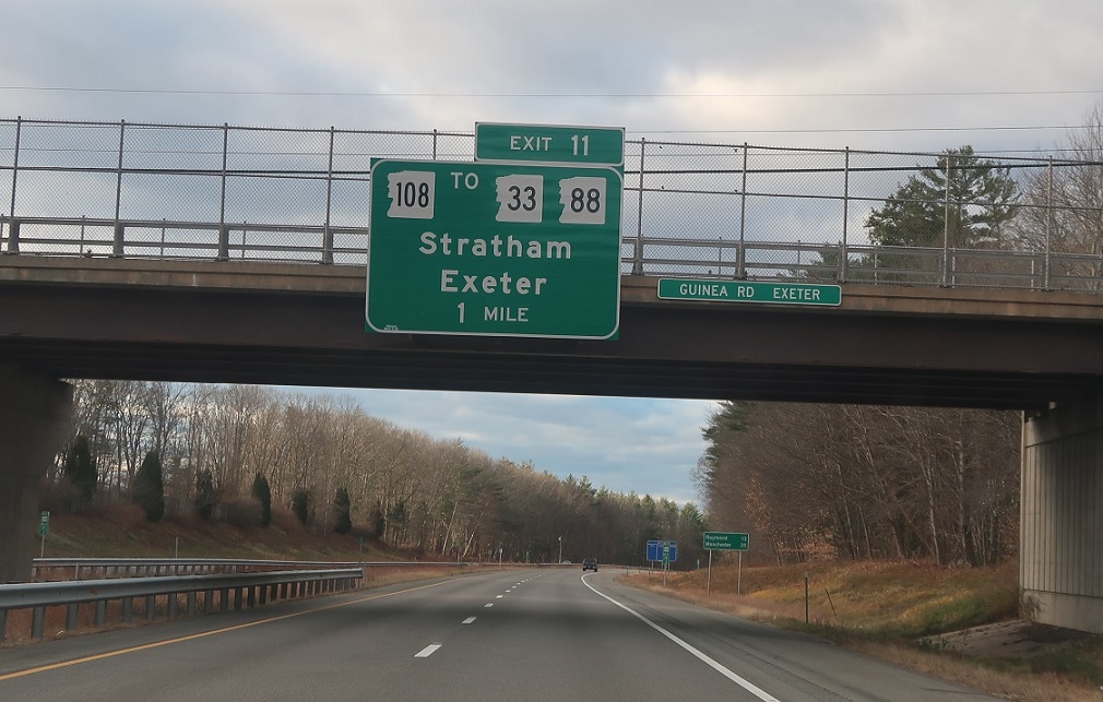Exit for Route 108, which heads south into Exeter center and north to Stratham.