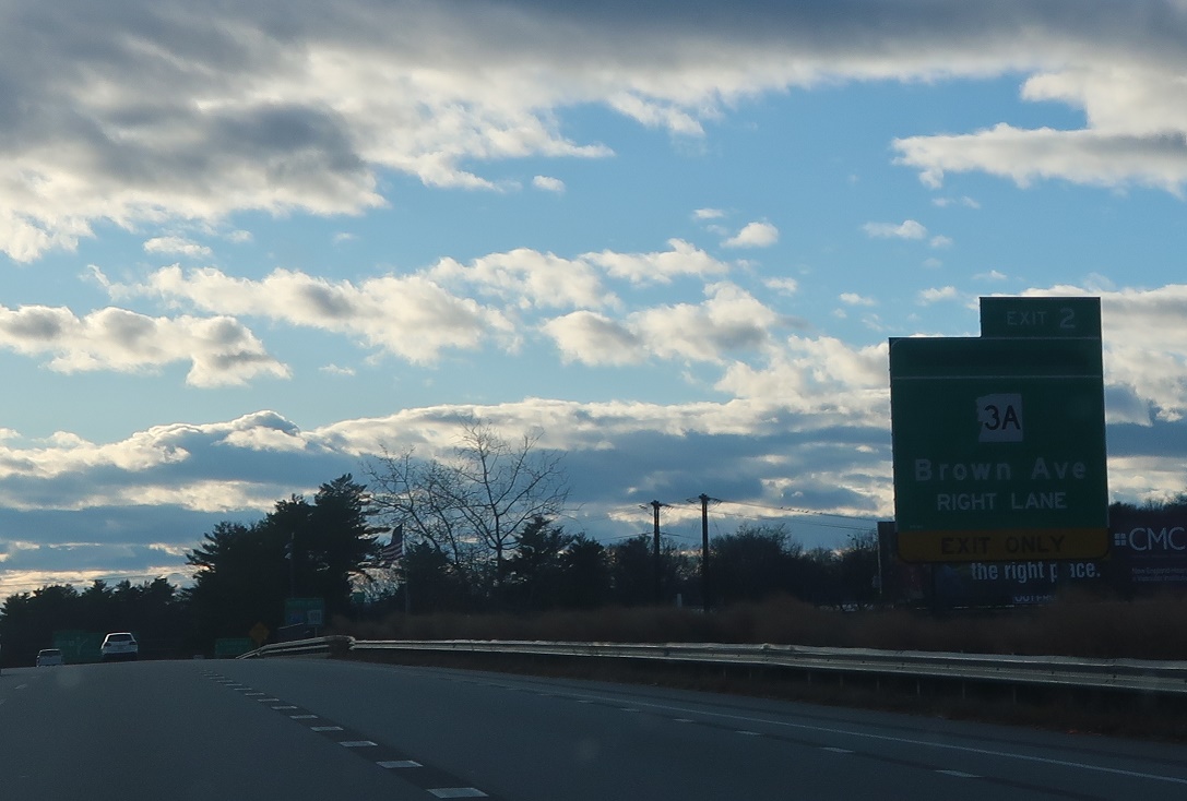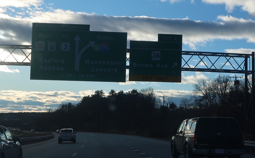 Exit for Route 3A. In one mile, Route 101 will split from I-293 as we also approach U.S. 3 and the Everett Turnpike.