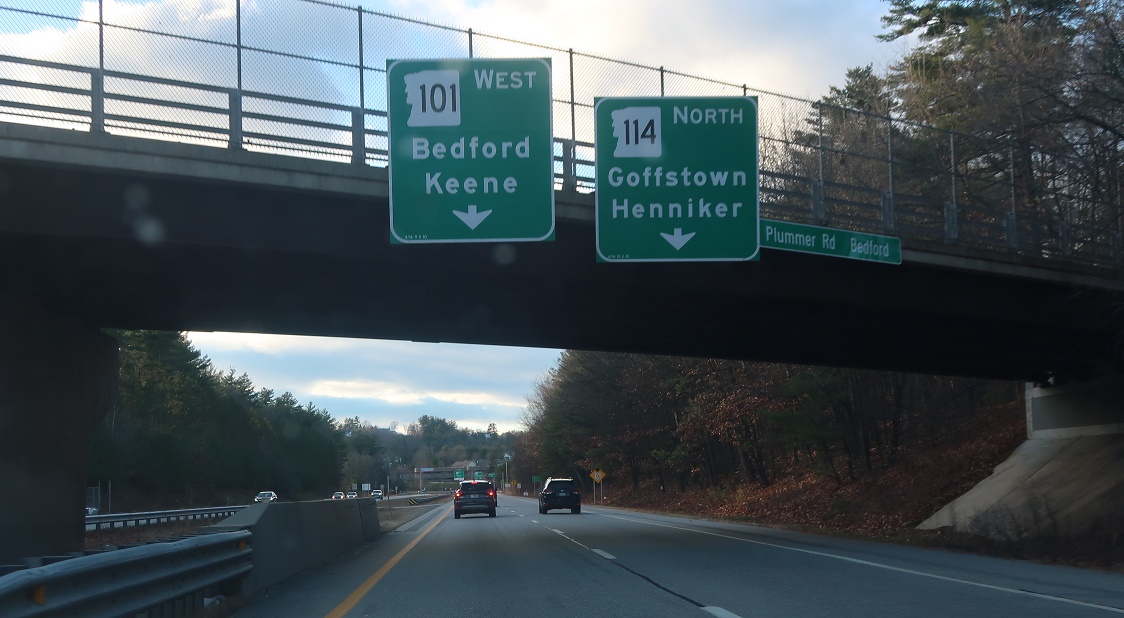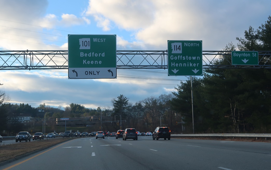 Turn left for Route 101 west towards Keene as the limited-access highway ends. Stay straight for 114 north to Goffstown and Henniker.