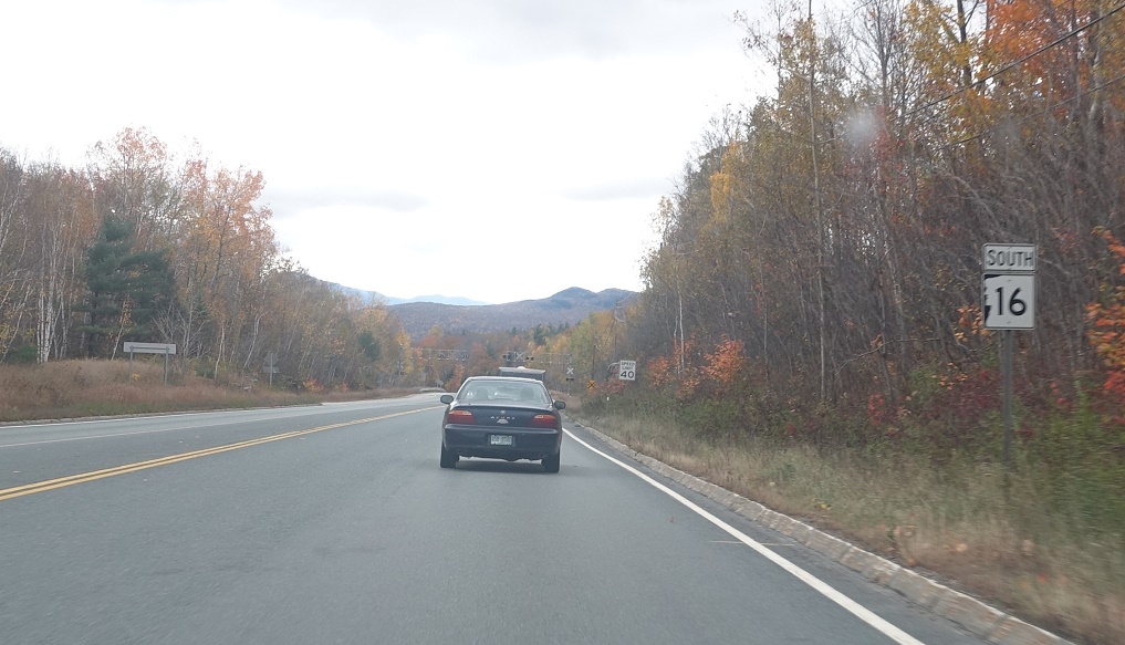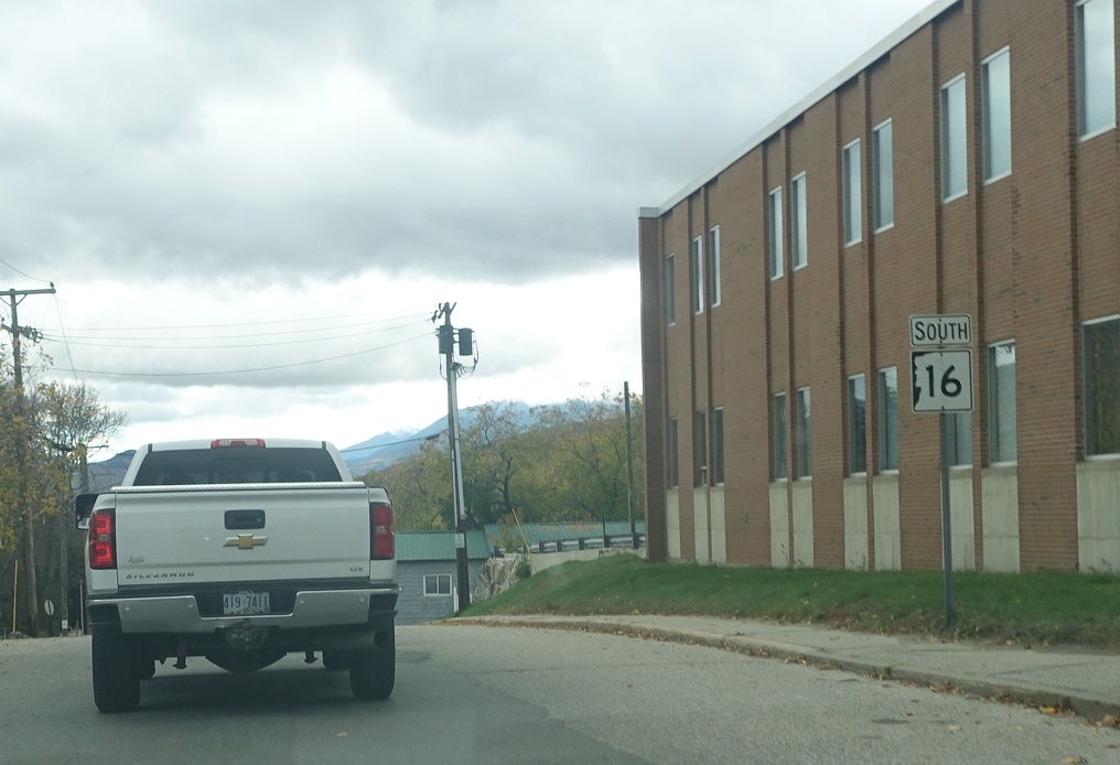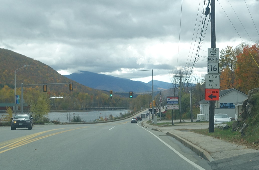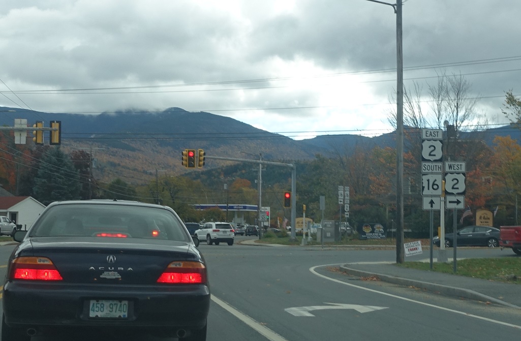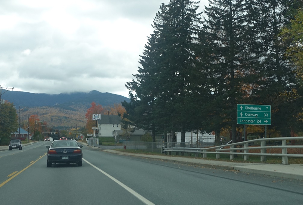 Stay straight for 2 east and 16 south, which run concurrently with 2 going to Shelburne, Maine and 16 going to Conway. Turn right for 2 west to Lancaster.