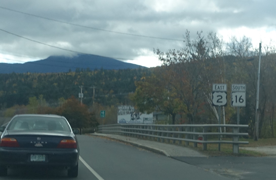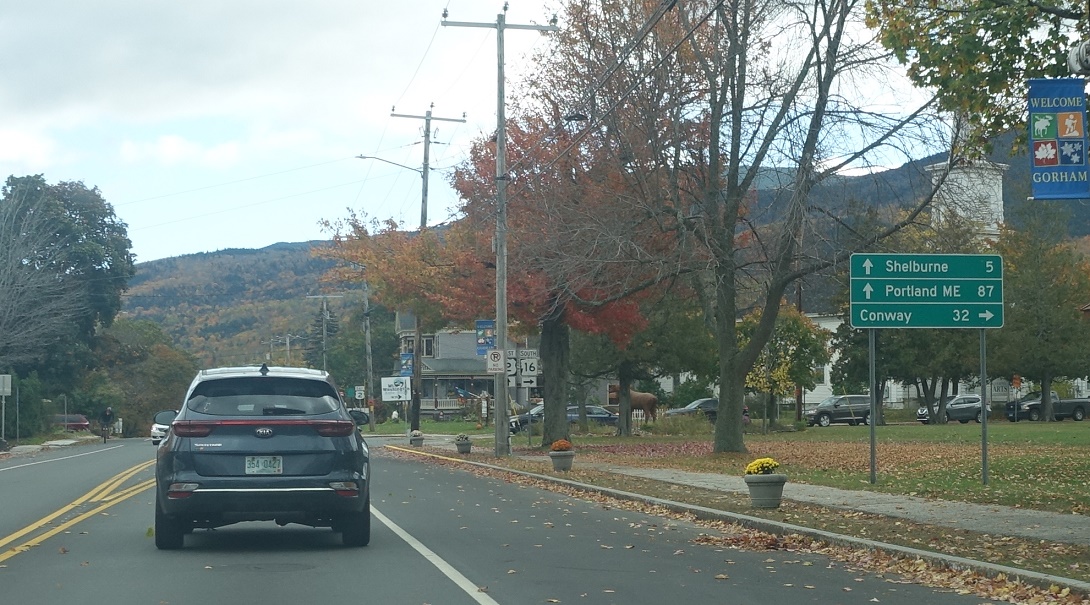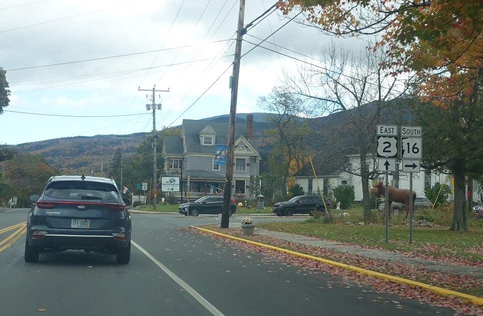 At Gorham Common, turn right for 16 south to Conway. Stay straight for 16 east to Shelburne, Maine and Portland, Maine. Only Portland gets a state identifier, which is somewhat odd since Portland is the larger city!