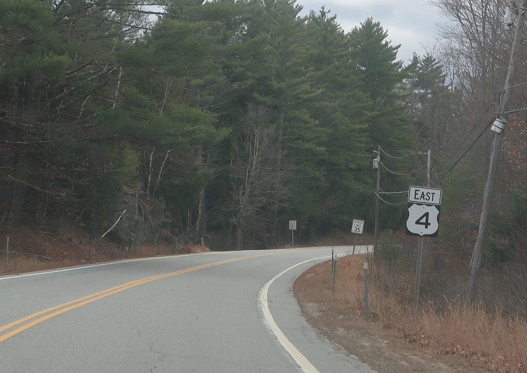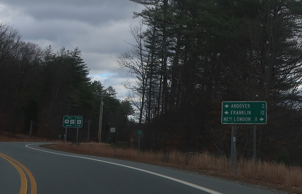 Follow 11 west to New London. 4 east briefly joins 11 east (using 11’s mileposts) through Andover center.