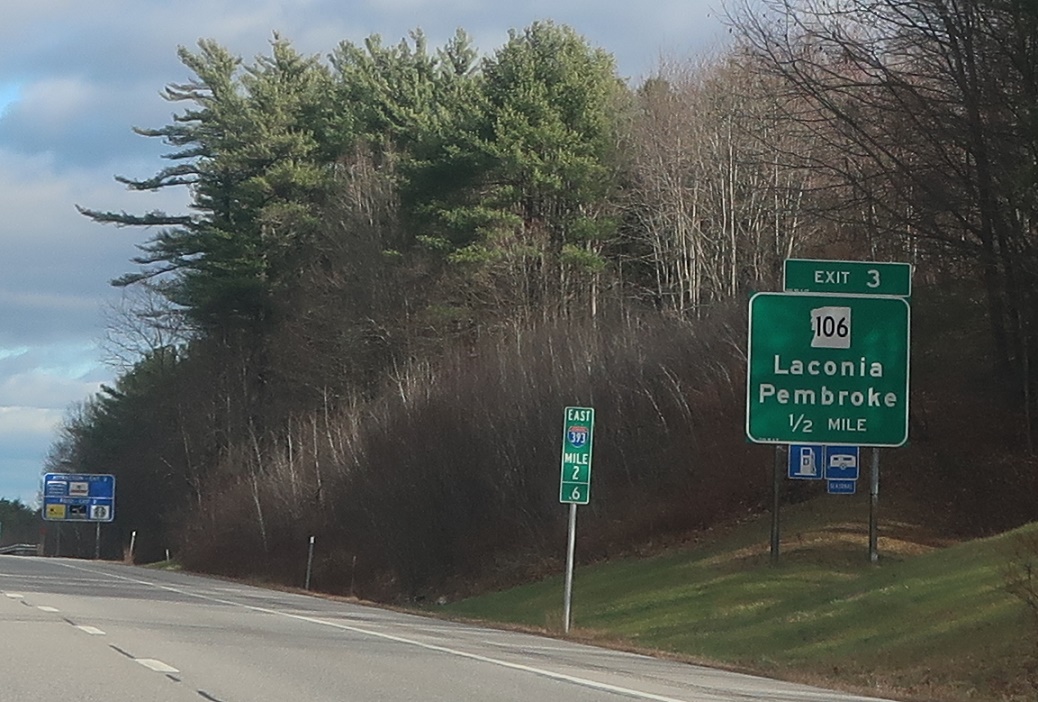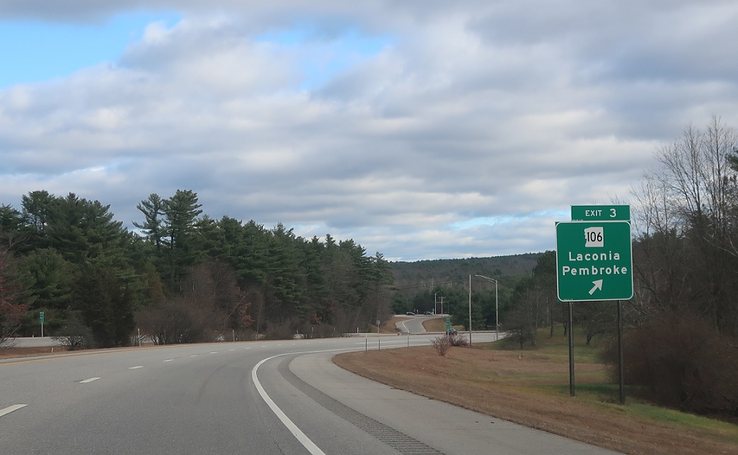 Exit for Route 106, which heads north to Laconia and south to Pembroke.