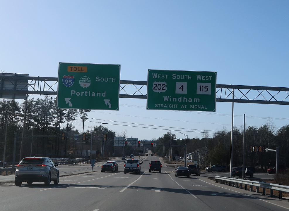 Turn right for I-95 south. Stay straight for 202/115 west and 4 south. After crossing I-95 a few times in Maine, U.S. 202 now will not touch it again until its southern terminus in Wilmington, Del.