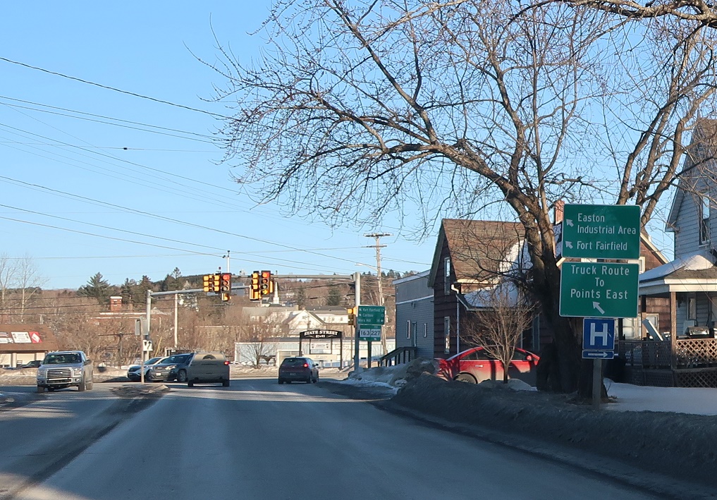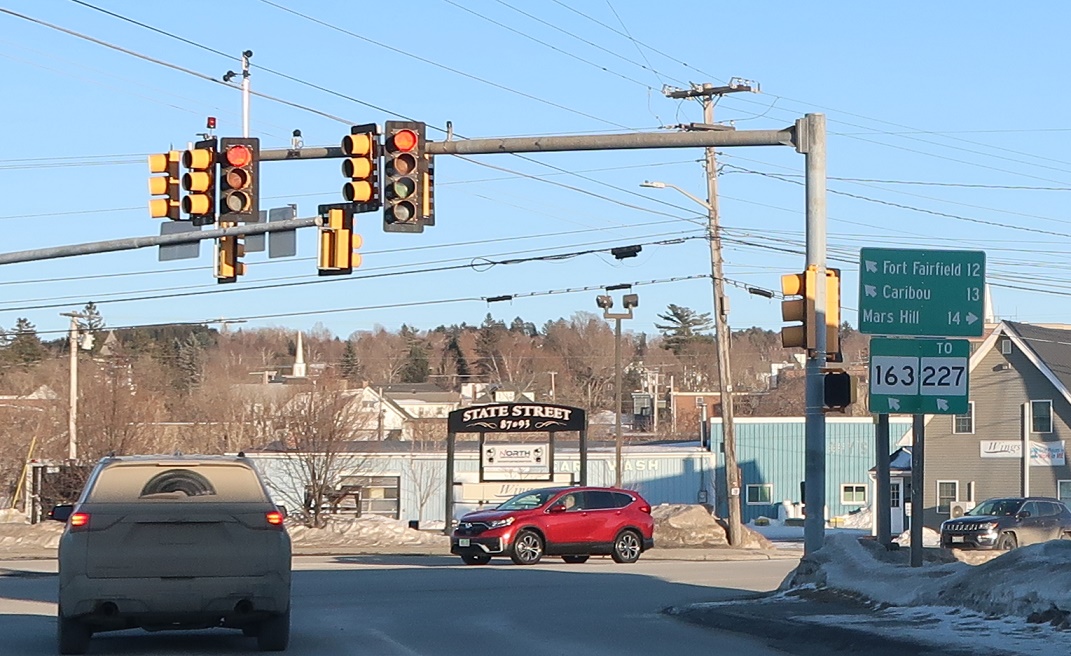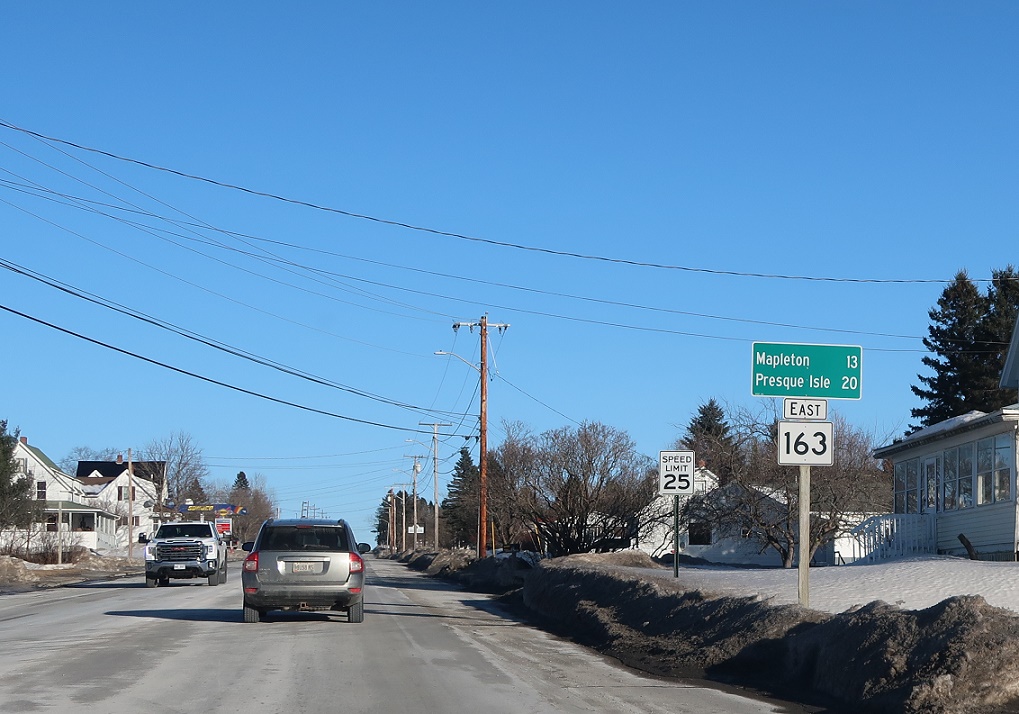 Turn left for 163 east and 227 west, which run concurrent, with 227 beginning here in a redundant concurrency. Follow 163 east towards Caribou and Fort Fairfield. Turn right for a local road connecting to U.S. 1 south and Mars Hill.