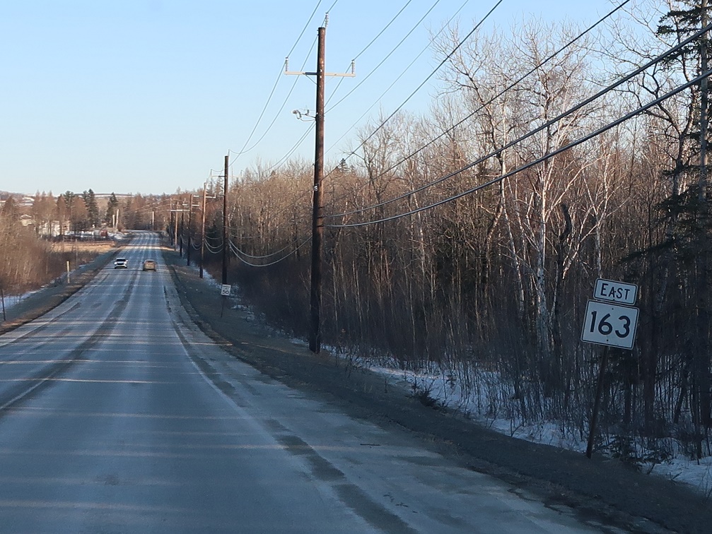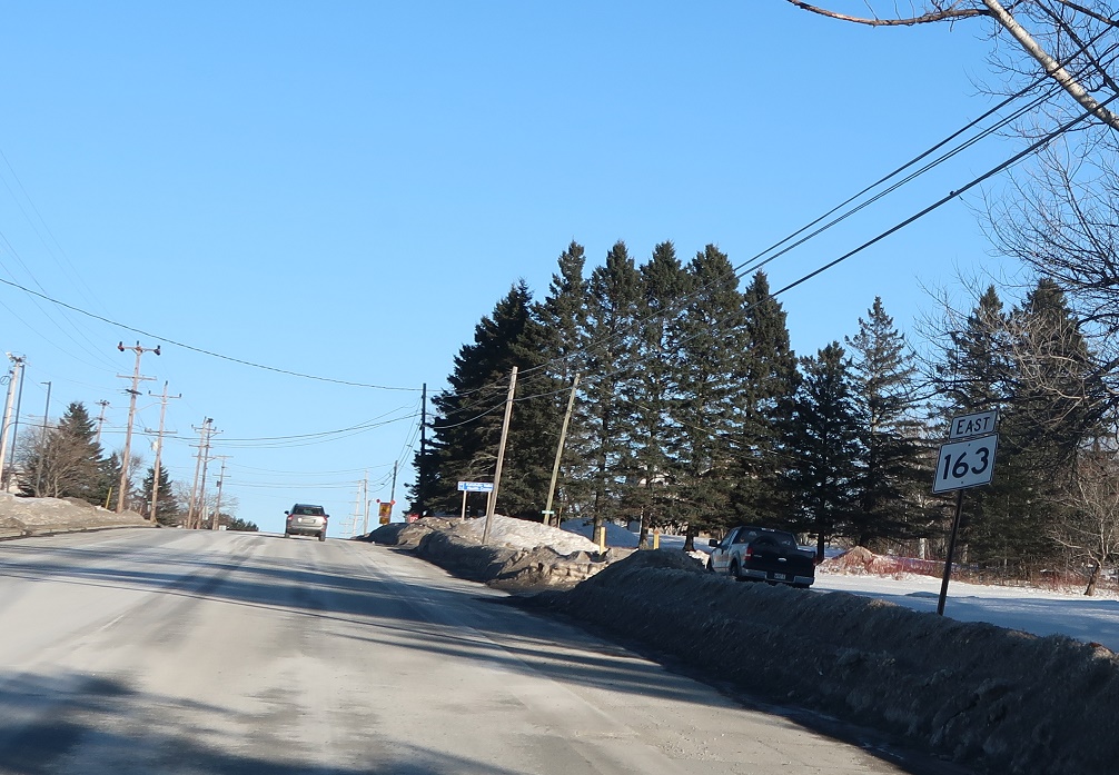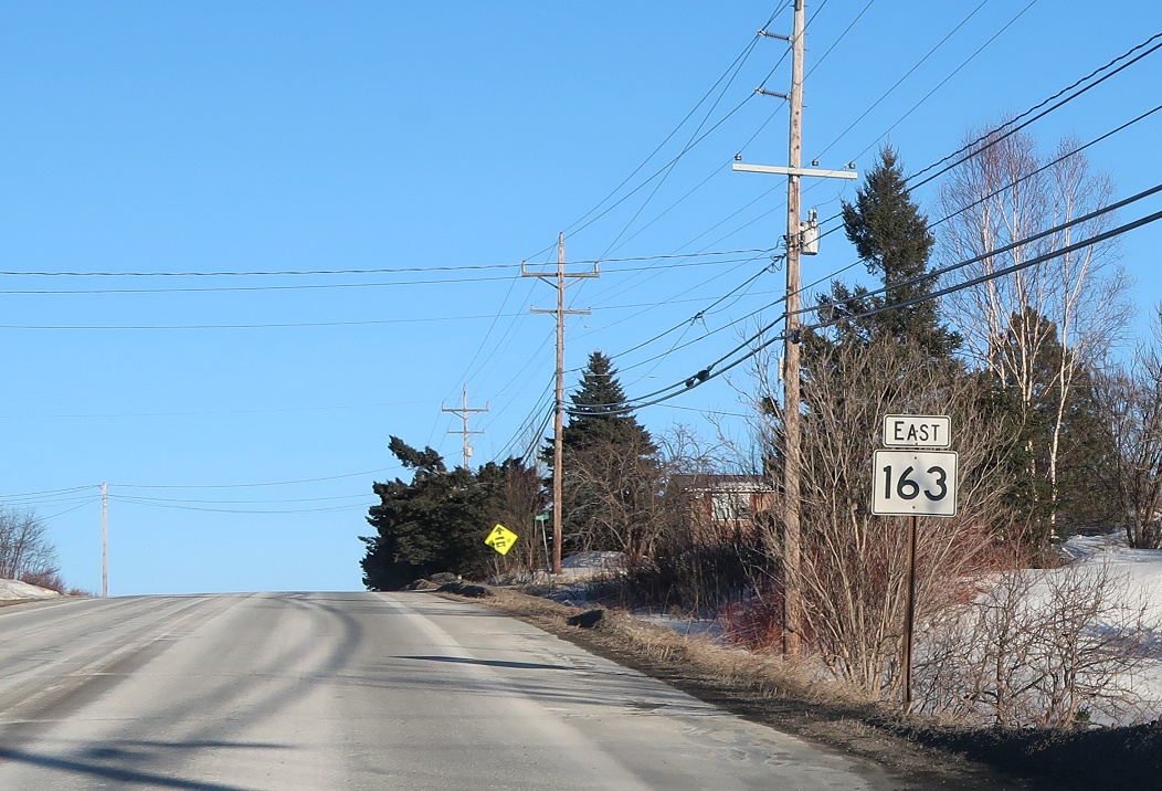 SR 163 finishes its role as the Ashland-Presque Isle connector and transitions to a truck route around the west and north ends of Presque Isle. Keep left to stay on 163 east.